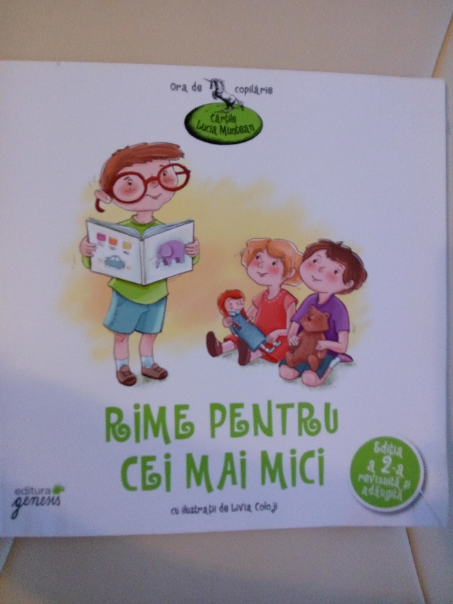 Nu ştiu dacă mai e nevoie de vreo prezentare pentru cărţile Luciei Muntean, extrem de apreciate şi cunoscute atât de părinţi, cât şi de educatori. Noi avem multe cărţi din această serie, pe prima dintre ele am citit-o zilnic şi de câte două-trei ori pe zi, până a fost memorată complet. Cartea Rime pentru cei mai mici este ilustrată foarte frumos de către Livia Coloji, deci putem spune că este 100% un produs românesc. Cel mai bun argument pentru mine ca părinte să continui să citesc această carte pentru fetiţa mea de 1 an şi 10 luni este plăcerea ei de privi ilustraţiile, felul cum caută detalii cu degeţelul şi, mai nou, bucuria de a completa versurile simple: Uite, Anca şi Răducu s-au ascuns şi strigă….CUCU!