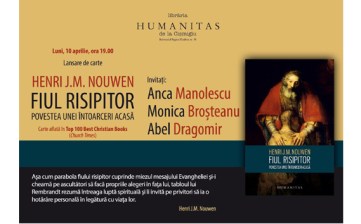 Editura Humanitas ne invită luni, 10 aprilie, ora 19.00, la Librăria Humanitas de la Cişmigiu, la lansarea volumului Fiul risipitor. Povestea unei întoarceri acasă de Henri J.M. Nouwen, carte aflată în Top 100 Best Christian Books, conform publicaţiei Church Times. La eveniment vor participa: Anca Manolescu, doctor în filozofie al Universităţii din Bucureşti, specialist în antropologie religioasă, studiul comparat al religiilor, Monica Broşteanu, traducătorul cărţii, conferenţiar universitar la Universitatea Bucureşti, specialist în ebraică biblică, teologie sacra mentală şi liturgică, ştiinţe biblice, şi Abel Dragomir, istoric, excelent cunoscător al operei părintelului Henri J.M. Nouwen.