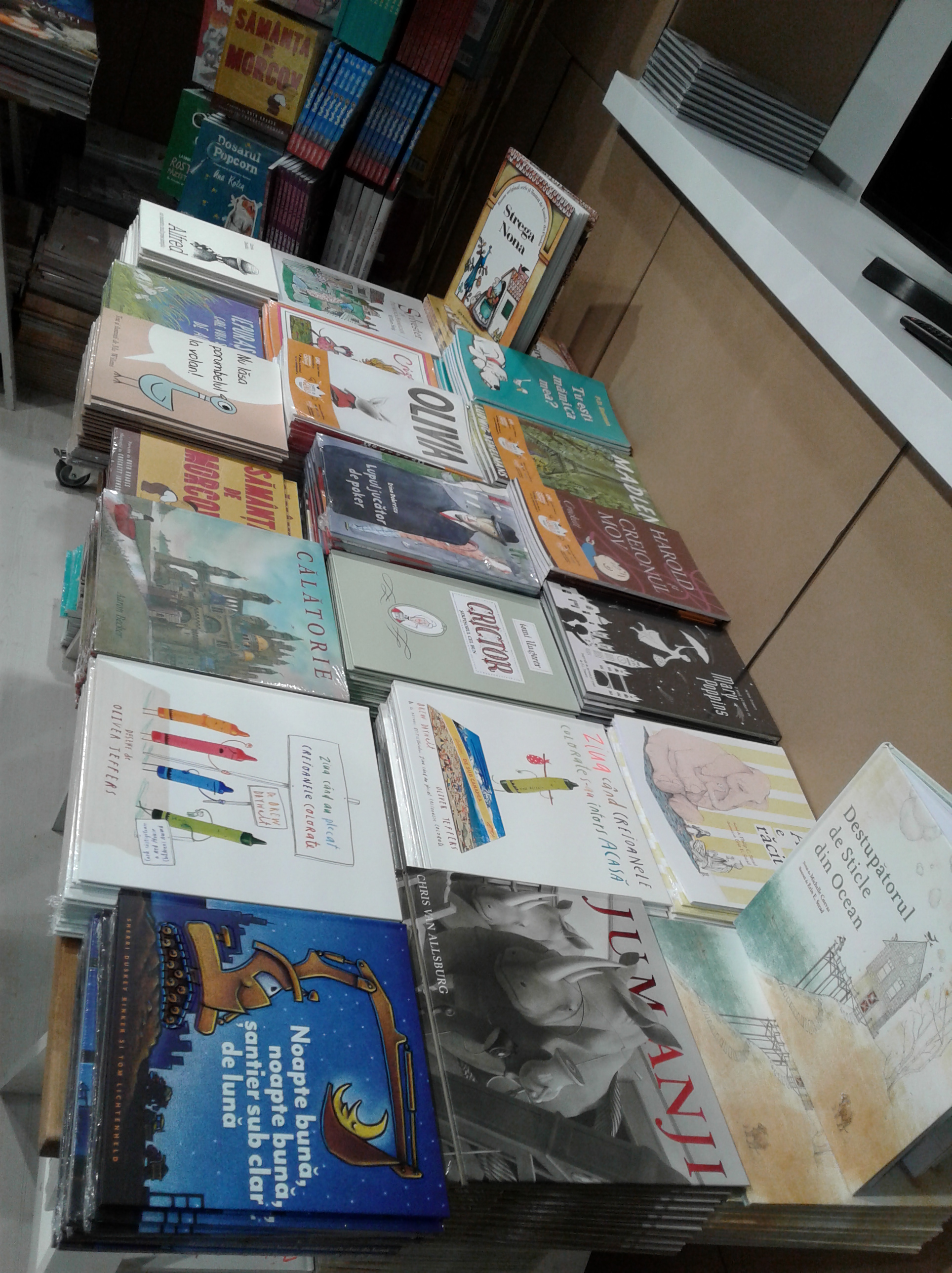 Copilul din cărți, Înțepenit, Cum să prinzi o stea, toate de Oliver Jeffers, recomandat des și aici pe blog, toate apărute la Editura Panda (27 lei, 16 lei, 18 lei, dacă îmi amintesc corect), Primăvara și Iarna de la Editura Univers Enciclopedic Junior (8 lei fiecare; merită să le vizitați standul, au reduceri de 50% la toate cărțile), Leul și pasărea de Marianne Dubuc (o superbitate de carte, Editura Panda, 20 lei), Pozna lui Jackie de Hiroyuki Aihara și Nami Adachi (Cartea Copiilor, 10 lei), Ela cea fără de cuvinte de Victoria Pătrașcu și Cristiana Radu (Cartea Copiilor, 20 lei), Păsările au aripi, copiii au cărți de Alain Serres, cu ilustrații de Lucille Placin (Cartea Copiilor, 20 lei), Micul nor de Eric Carle (Cartea Copiilor, 25 lei), Spărgătorul de nuci, teatru radiofonic după E.T. Hoffmann (Radio România, 17 lei, carte cu CD) și The Best Christmas Present in the World de Michael Morpurgo (Okian, 20 lei) și cărți cu abțibilduri de la Editura Girasol.