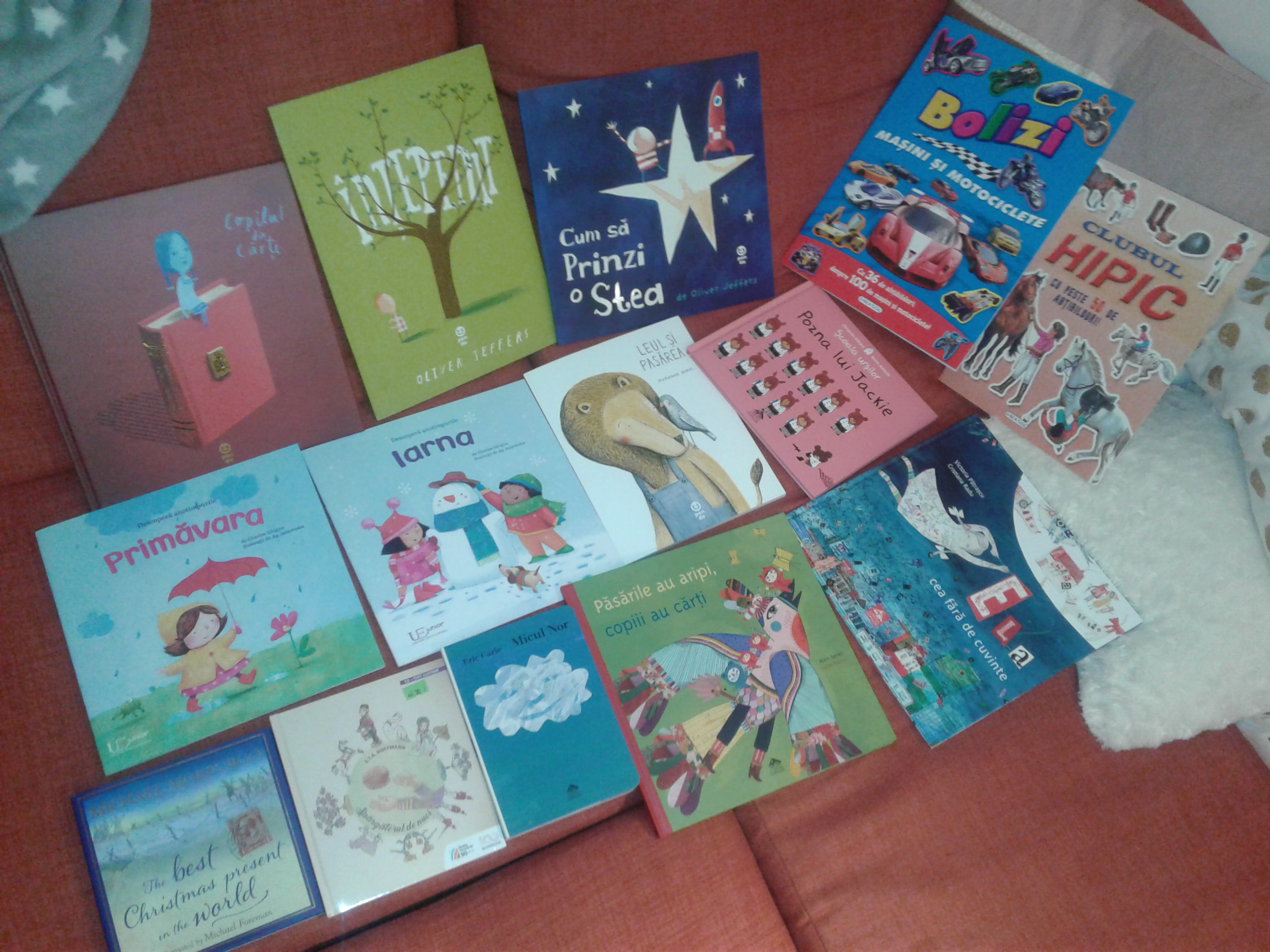 Și în finalul finalului, așa cum v-am promis, iată cu ce m-am întors eu după vizita de miercuri: multe cărți pentru copii, printre care și una frumoasă legată de Crăciun.