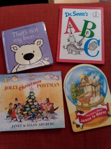 uitându-ne mai ales la cărțile pentru copii pe care Mihai le-a luat la rând cu încântare, așa că am plecat de acolo cu 4 cărți (una luată din dorința lui Mihai, deși e de bebeluși…): That’s Not My Bear (o carte senzorială Usborne), Dr. Seuss’s ABC (care l-a amuzat grozav pe Mihai, punându-mă să-i repet la nesfârșit „googoo googles” până l-a luat sughițul și râgâitul de atâta râs), Sing Glory, Glory, Jesus Is Born! de Gail Pawlitz și The Jolly Christmas Postman de Janet și Allan Ahlberg.