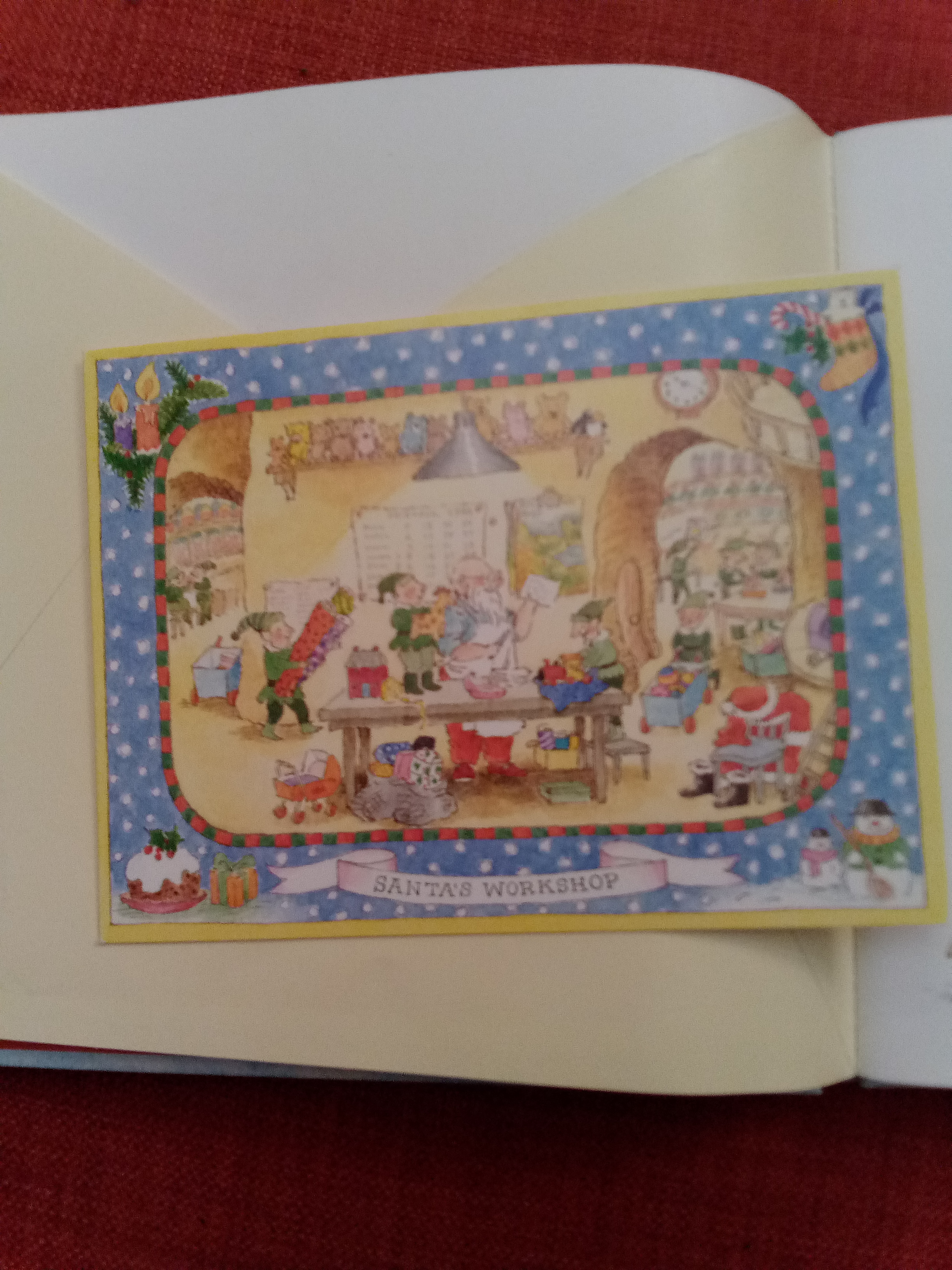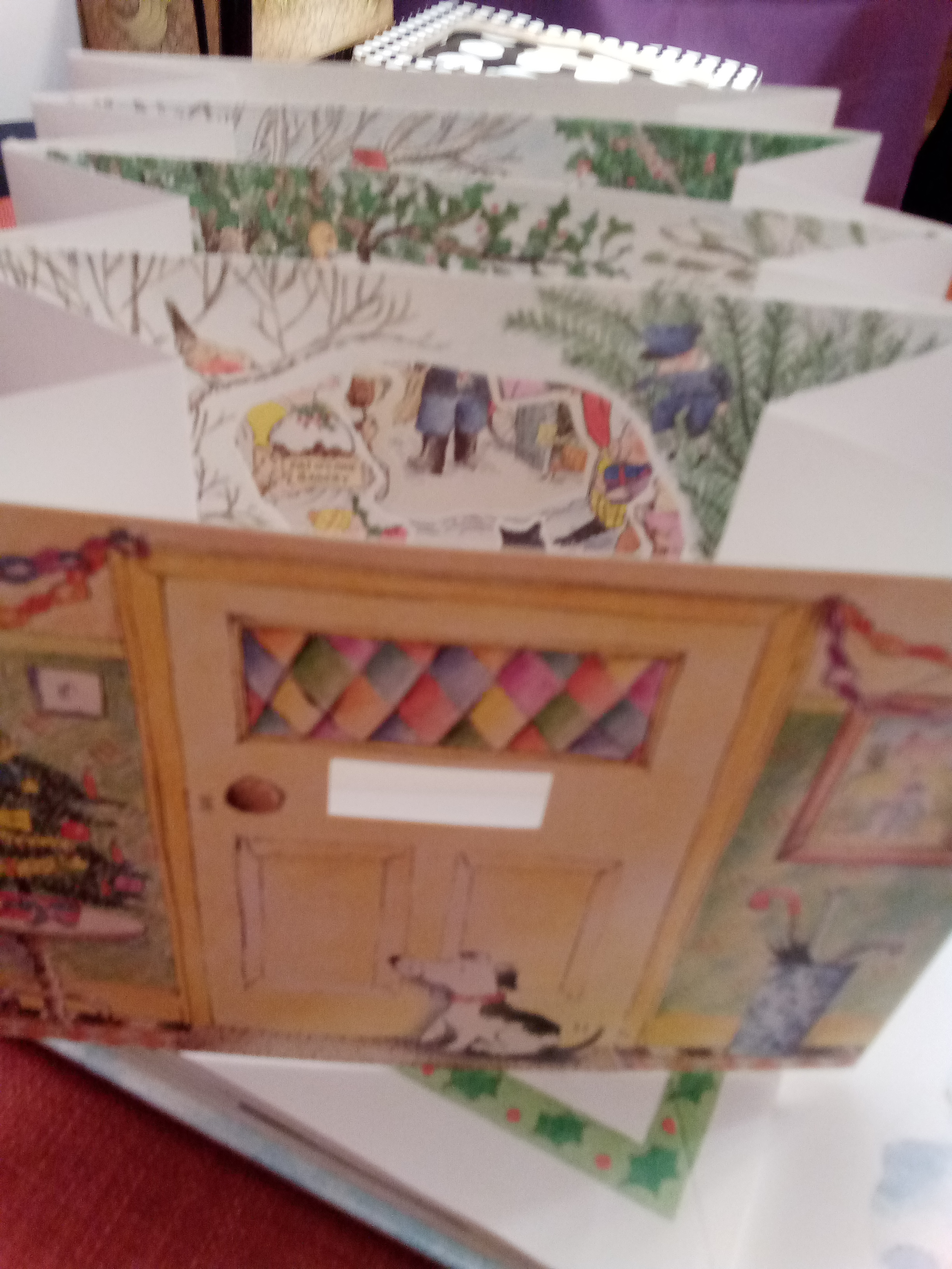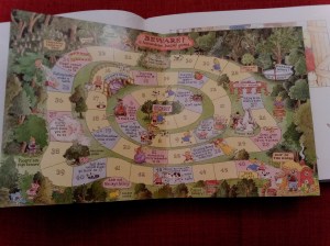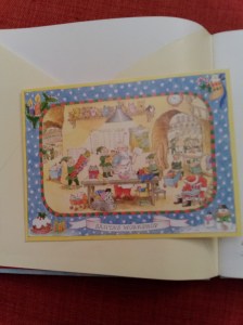 Asupra acesteia din urmă vreau să insist un pic, mai ales că este tradusă și în limba română, Crăciunul cu poștașul vesel. Acest poștaș livrează scrisori și cadouri personajelor din basmele clasice. Astfel, cei patru ursuleți primesc o carte poștală de la Bucle-Aurii, Scufița-Roșie primește un joc de societate de la Lup, Humpty Dumpty primește un puzzle cu el însuși, iar poștașul primește o felicitare pop-up de la Moș Crăciun. Toate aceste „cadouri” chiar sunt incluse în carte în plicuri, după cum puteți vedea în imagini, făcând astfel din întregul volum un pachet de joacă minunat.