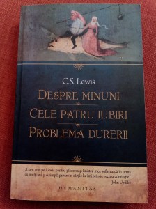 Lectura cărții lui C.S. Lewis o văd ca pe o realizare personală, pentru că, deși sunt des citate pasaje din ea prin alte cărți, trebuie să te lupți puțin să descoperi în original acele pasaje des citate, în sensul că nu e o carte ușor de citit. Deși este despre subiectul preferat al multora, iubirea, el o abordează foarte obiectiv și riguros, subliniind pericolele fiecărui tip de iubire în parte (așa cum le identifică el), dacă acestea nu sunt subordonate Iubirii divine. Avem articol și emisiune în care vorbim pe larg despre ea, așa că nu o să mai insist, dar vreau să vă împărtășesc un pasaj care mi-a plăcut și pe care nu mi-l amintesc să-l fi găsit citat pe undeva: