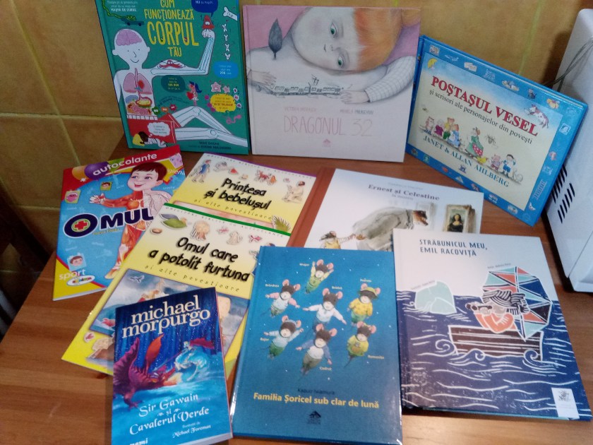 Am comandat apoi mai multe cărți pentru Ziua Copilului și vacanță, dintre care am citit înainte de a le pune la păstrare Dragonul 32 de Victoria Pătrașcu și Mihaela Paraschivu (o poveste fantastică țesută în jurul călătoriei cu faimosul tramvai 32 din București, în vecinătatea căruia locuim și noi, deși nu îl folosim la fel de des), Străbunicul meu, Emil Racoviță de Andreia Petcu, cu ilustrații de Eugen Berlo (o carte pe care doream să i-o cumpăr de mult, o tot pândeam să fie redusă, acum era cu 20%; în plus, am citit de curând cu el despre Poli și Antarctica, așa că cred că îi va plăcea) și Poștașul vesel și scrisori ale personajelor din povești de Janet și Allan Ahlberg (o altă carte pe care voiam să i-o cumpăr de când am descoperit astă-iarnă varianta de Crăciun care ne-a plăcut foarte mult, despre care am scris aici).