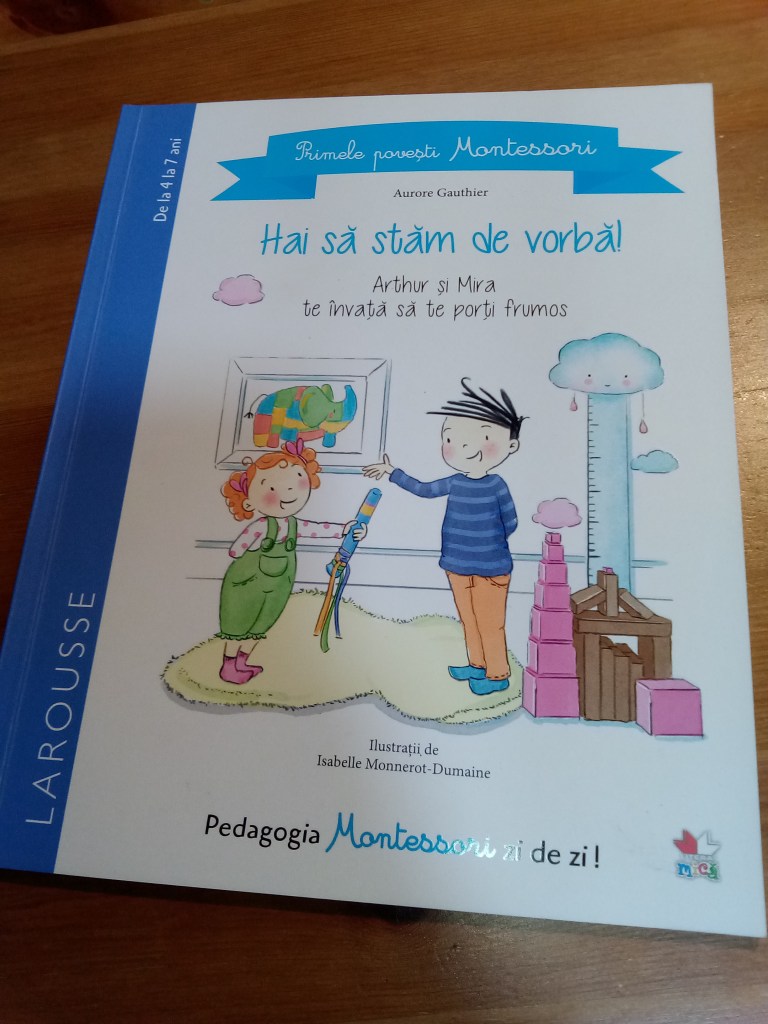 Prima este Hai să stăm de vorbă! Arthur și Mira te învață să te porți frumos de Aurore Gauthier, din colecția Larousse Primele povești Montessori – Pedagogia Montessori zi de zi (care văd că se epuizează repede, trebuie să le pândiți). Îmi place foarte mult această colecție pentru că încurajează independența și căutarea soluțiilor prin exemplu, iar ilustrațiile sunt tare drăgălașe și l-au atras pe Mihai.