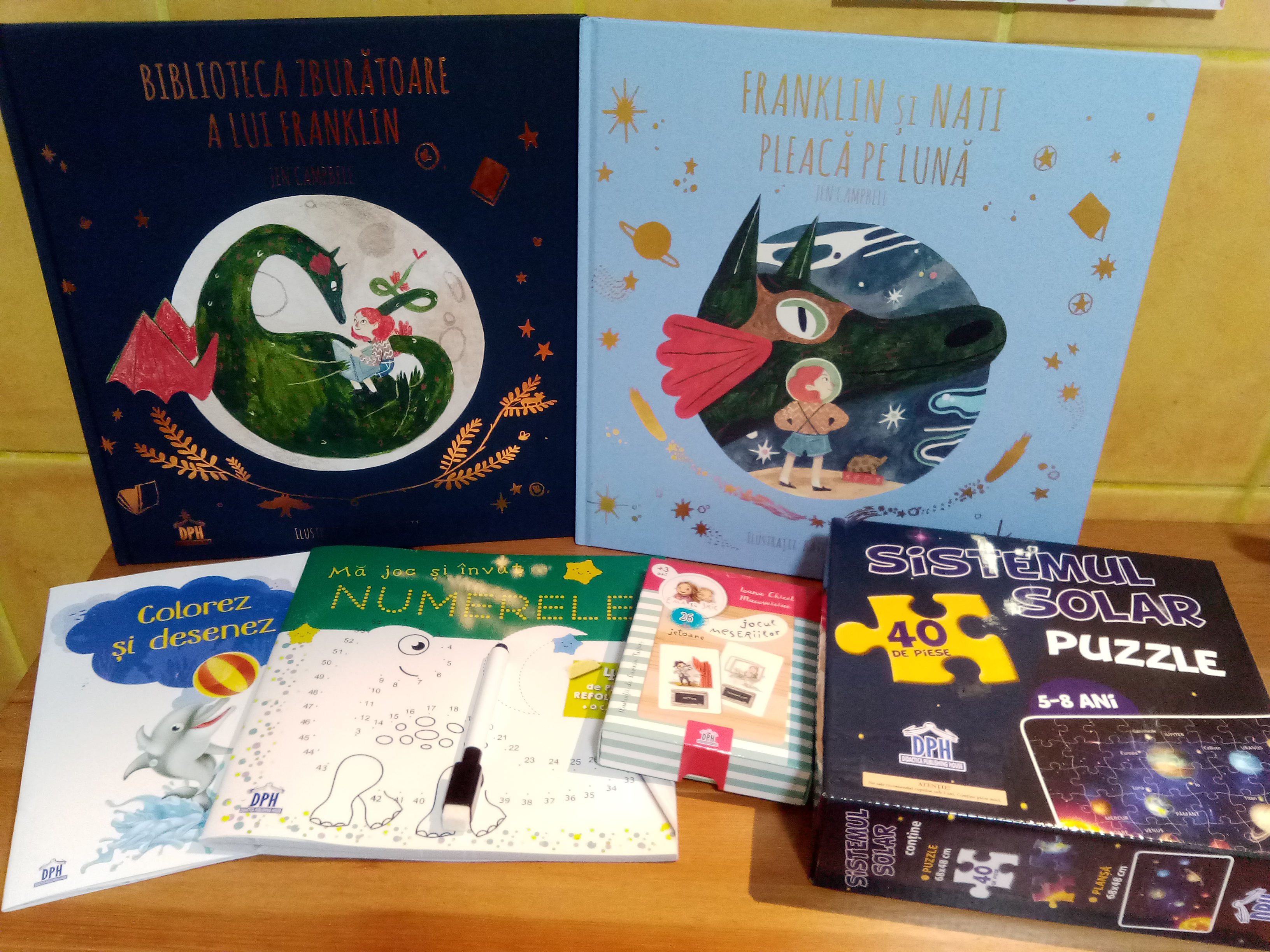 Trecâââââând peste acest aspect, care probabil că mă preocupă și deranjează doar pe mine, cărțile sunt foarte frumoase și, mai ales, cea de-a doua, care este în versuri, bine tradusă, ceea ce e lucru rar. În prima, „Nati” face cunoștință cu un dragon prietenos, Franklin, și înființează împreună o bibliotecă zburătoare, iar în a doua, pleacă împreună în căutarea rudelor lui Franklin, pe care le găsesc tocmai pe Lună.
