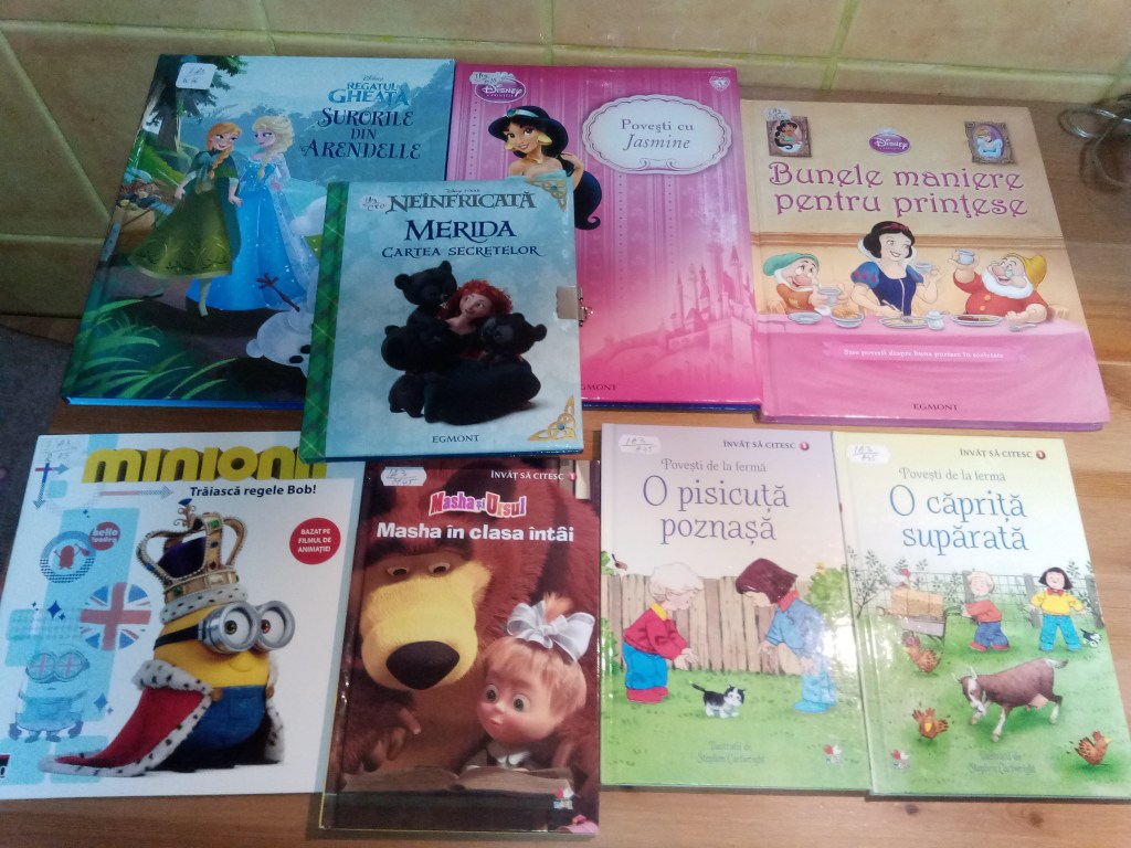 După întoarcerea din vacanță, am fost din nou cu Mihai la bibliotecă și i-am citit într-o după-amiază de sâmbătă cam tot ce am împrumutat cu această ocazie, cele 4 cărți mari – Regatul de gheață – Surorile din Arendelle, Povești cu Jasmine, Bunele maniere pentru prințese și Minioni – Trăiească regele Bob!.