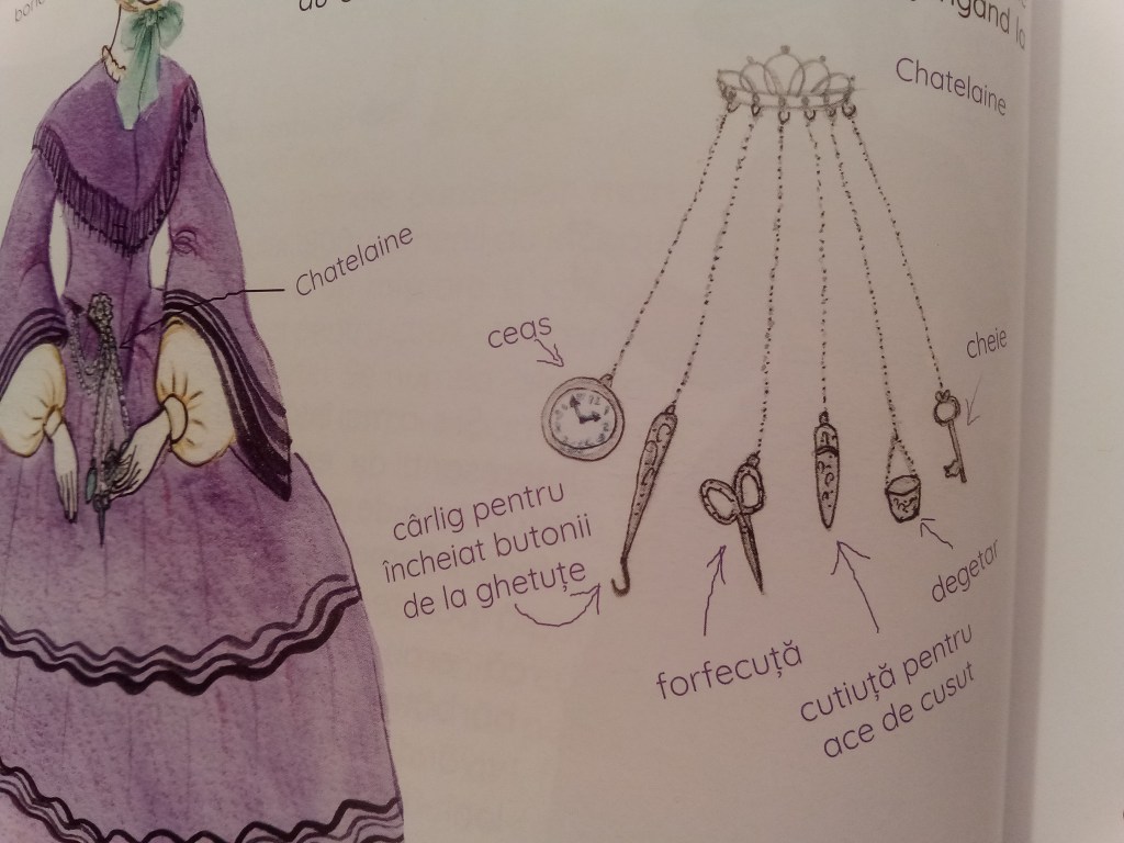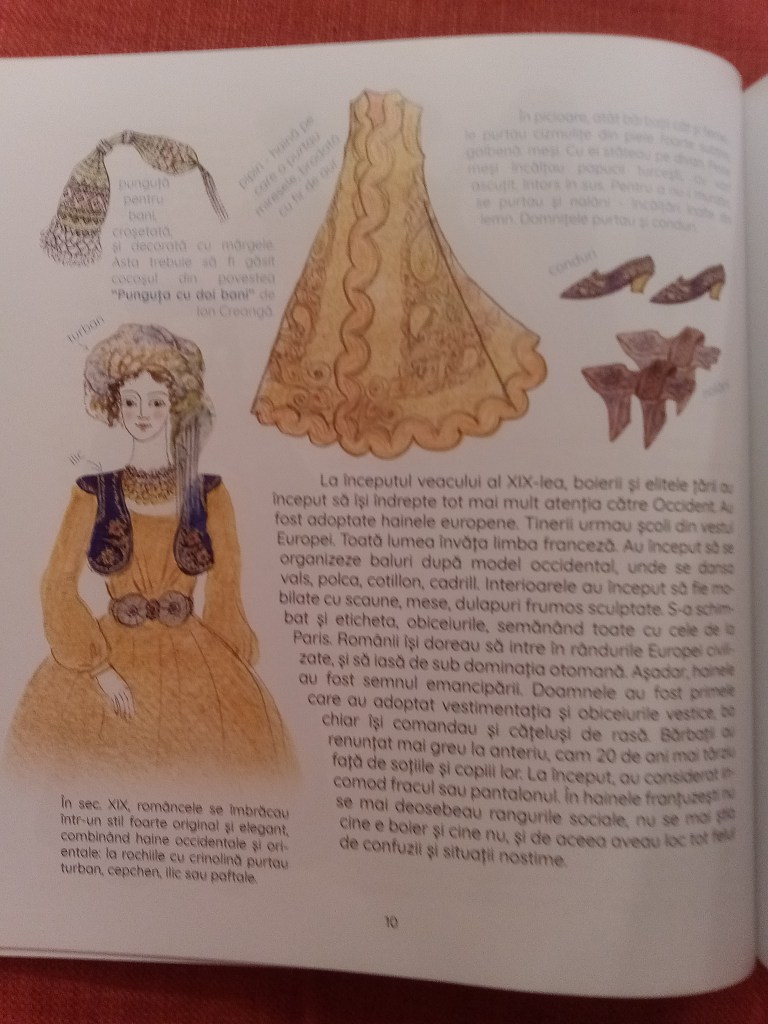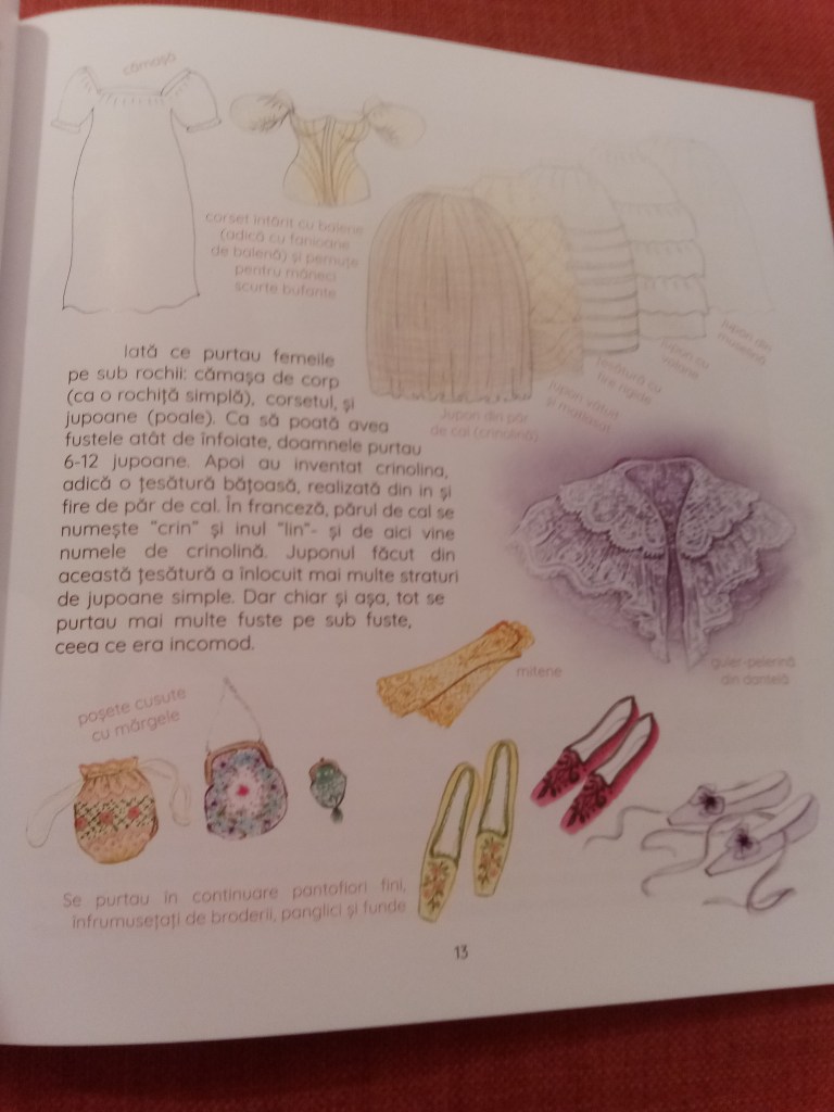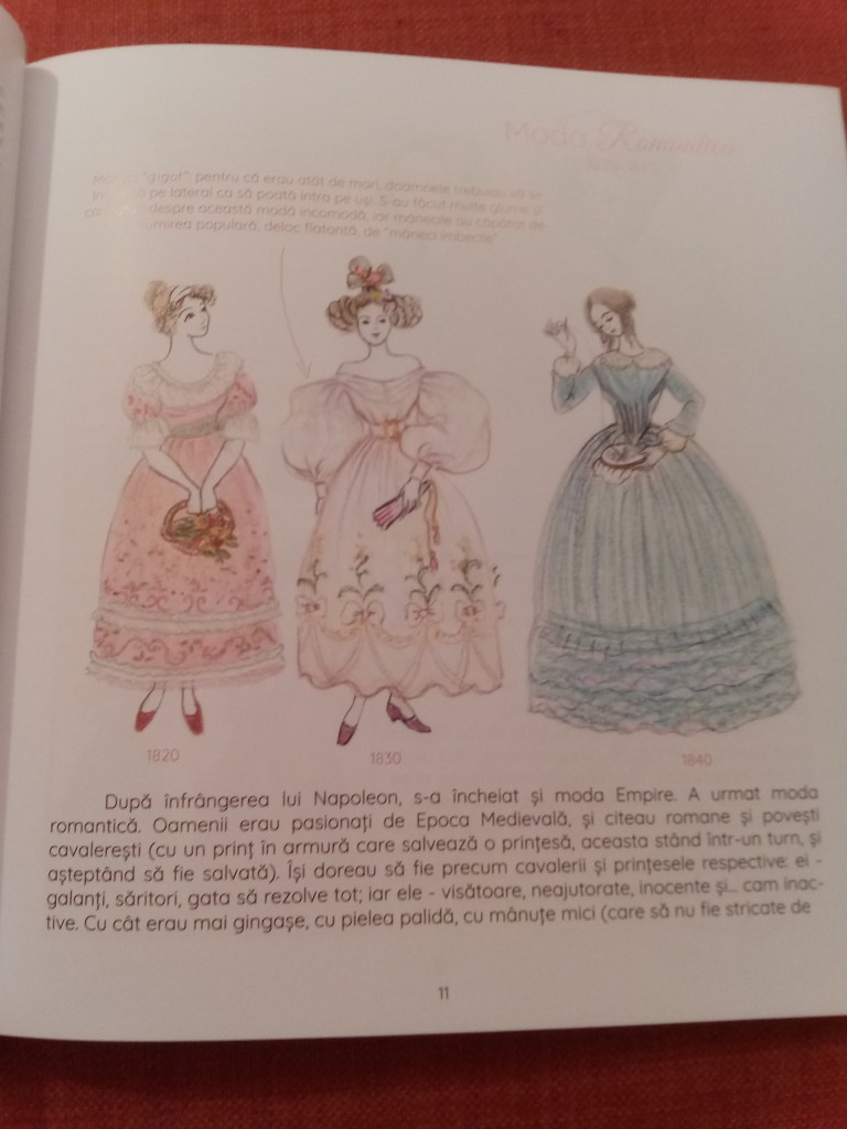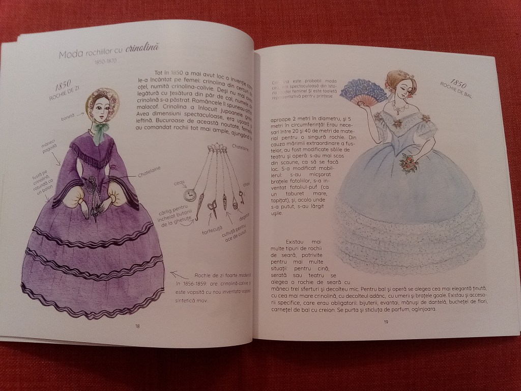 Eu am împrumutat o broșură ilustrată pentru copii, apărută cu sprijinul și finanțarea Kinofest și a Ministerului Culturii și Identității Naționale, intitulată Straie alese din povești cu prințese. Moda din secolului al XIX-lea de Raluca Alexandra Partenie, din care puteți vedea mai jos câteva pagini.
