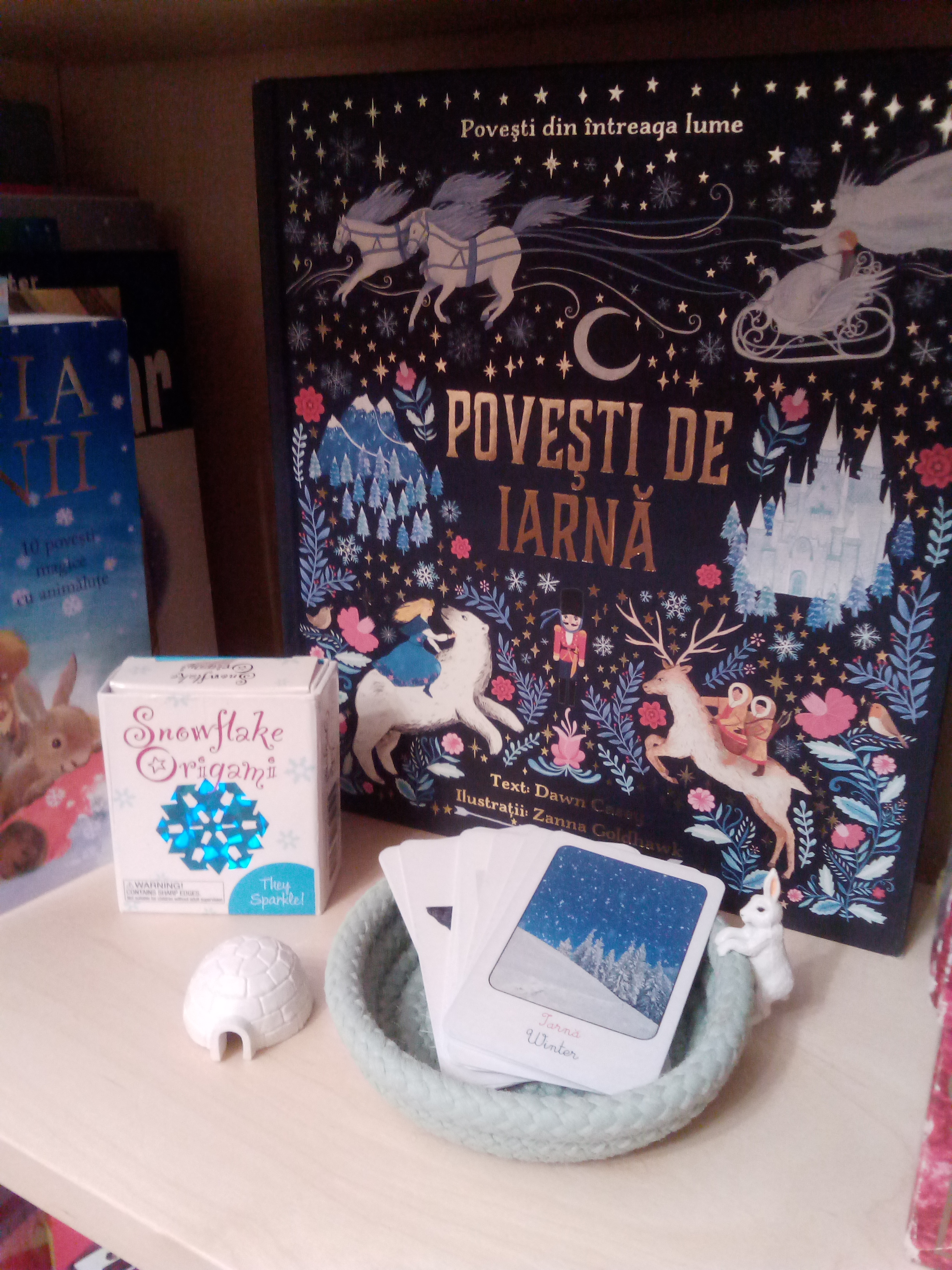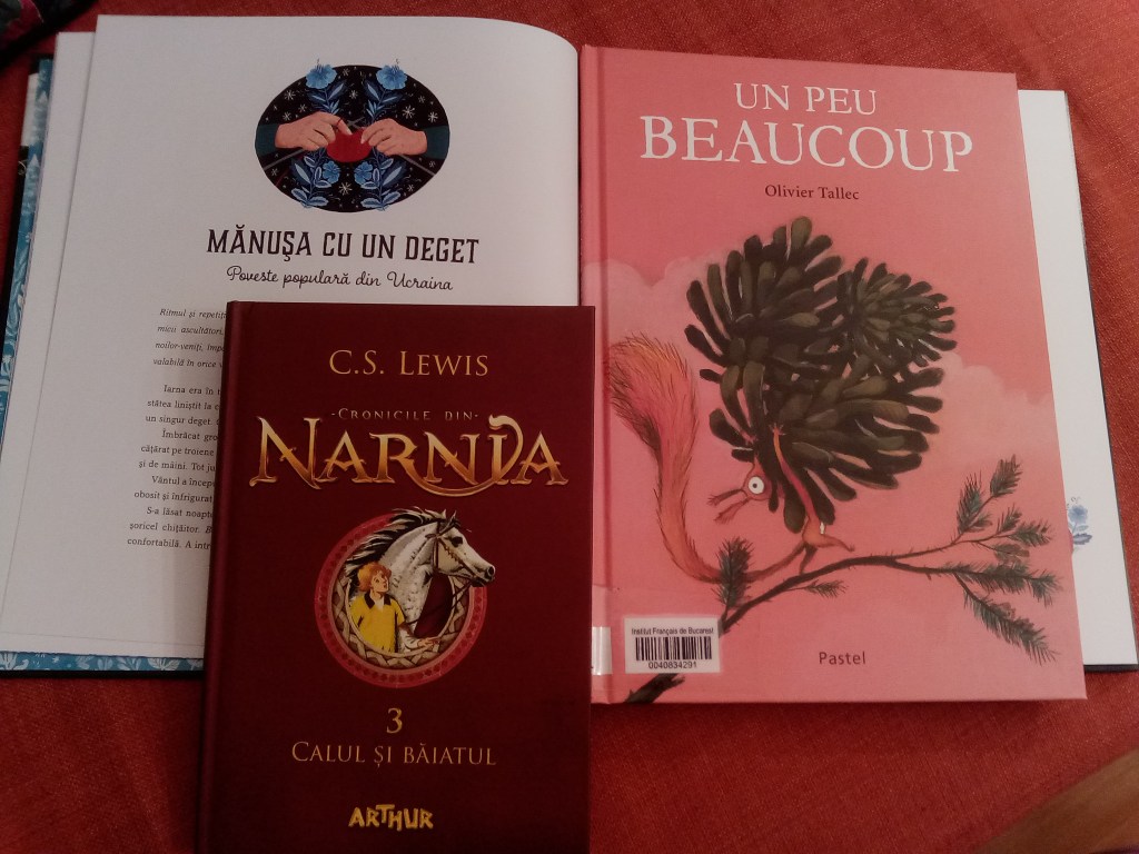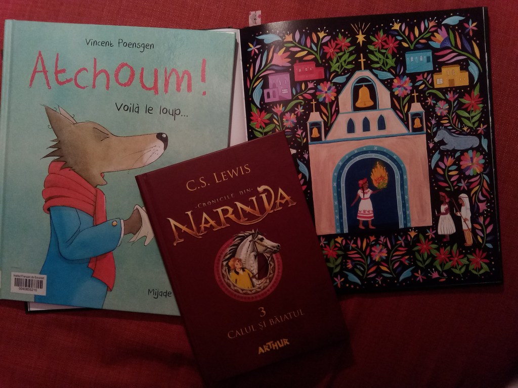 Am început/continuat în același timp să citim în paralel Biblia povestită celor mici – 30 de povestiri devoționale, Povești de iarnă de Dawn Casey cu ilustrații SUPERBE de Zanna Goldhawk și Calul și băiatul, volumul 3 din Cronicile din Narnia de C.S. Lewis (început anul trecut). Pe acestea ne-a luat aproape toată luna să le parcurgem, pentru că citeam din fiecare câte o poveste/un capitol pe zi și au fost și zile în care nu am citit.
