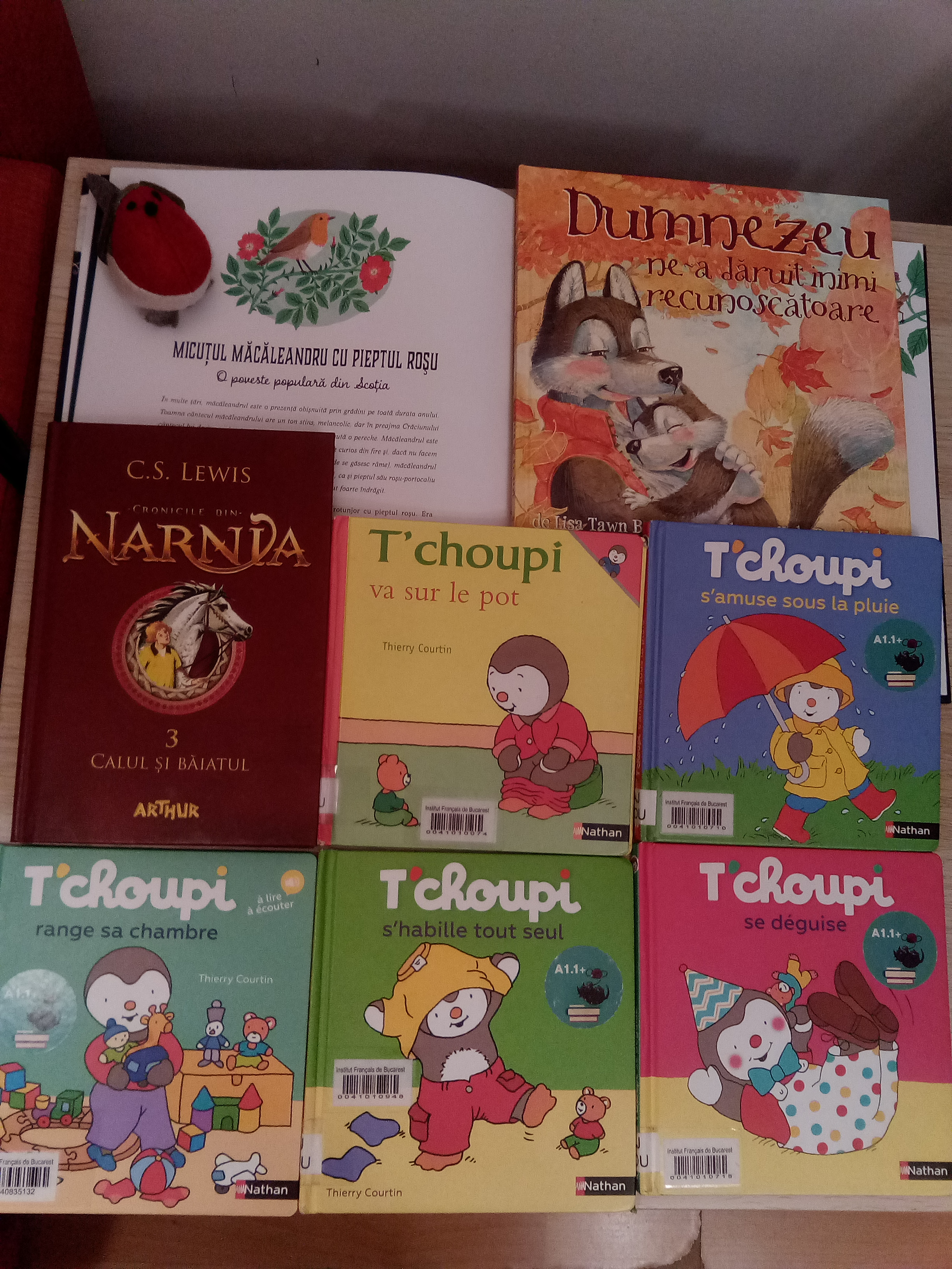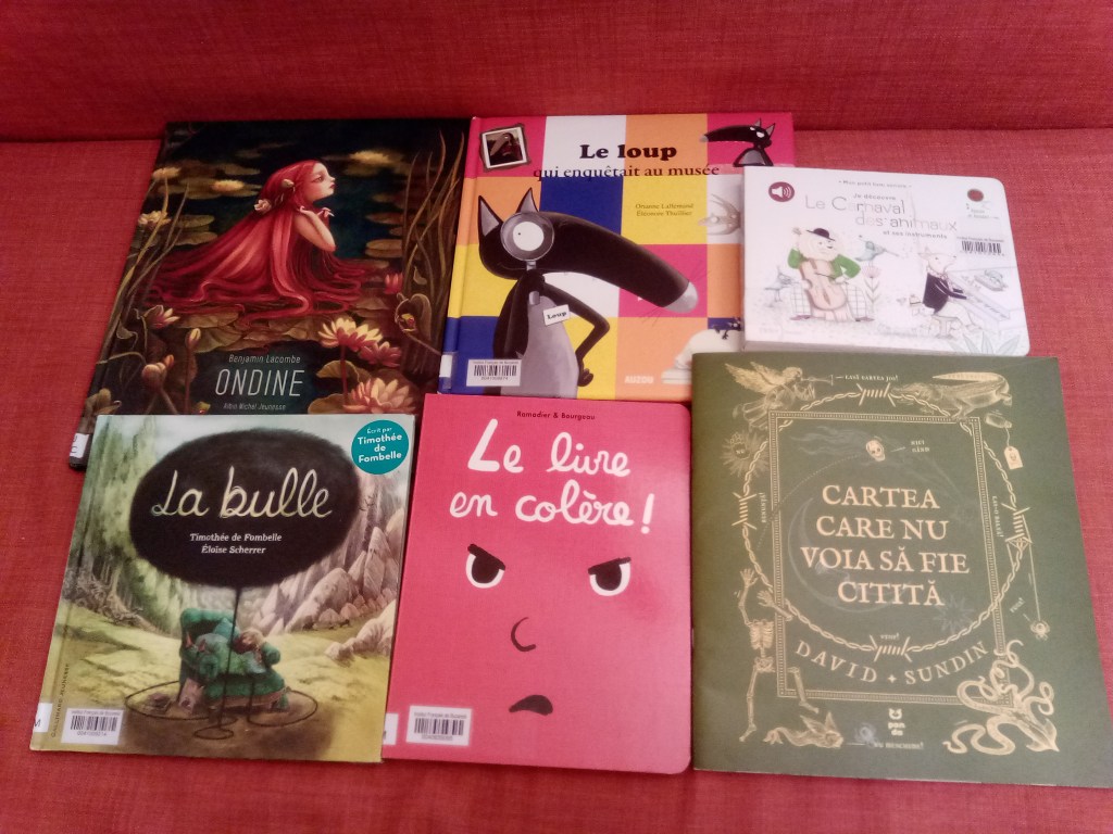 Am mai citit apoi niște cărți împrumutate de la Institutul francez: Le permis d’être un enfant de Martin Page, Un peu beaucoup de Olivier Tallec, Le souffleur de rêves de Bernard Villiot și Thibault Prugne (în română, Suflătorul de vise; tare mult m-am chinuit cu traducerea din franceză și cu scrisul minuscul în penumbra din dormitor ;)) ), Le Loup qui ne voulait plus marcher și Le Loup qui enquêtait au musée de Orianne Lallemand și Eleonore Thuillier, Atchoum! Voilà le loup! de Vincent Poensgen (o reinterpretare simpatică a basmului Cei trei purceluși), Le livre en colère! de Cédric Ramadier și Vincent Bourgeau (o carte care „vorbește” cu cititorul, cerându-i să ajute cartea în sine să depășească un moment de furie; lui Mihai i-a plăcut foarte mult!), T’choupi se déguise de Thierry Courtin și La bulle de Timothée de Fombelle și Eloise Scherrer (o carte poetică și metaforică despre lupta cu depresia și înfrângerea acesteia).