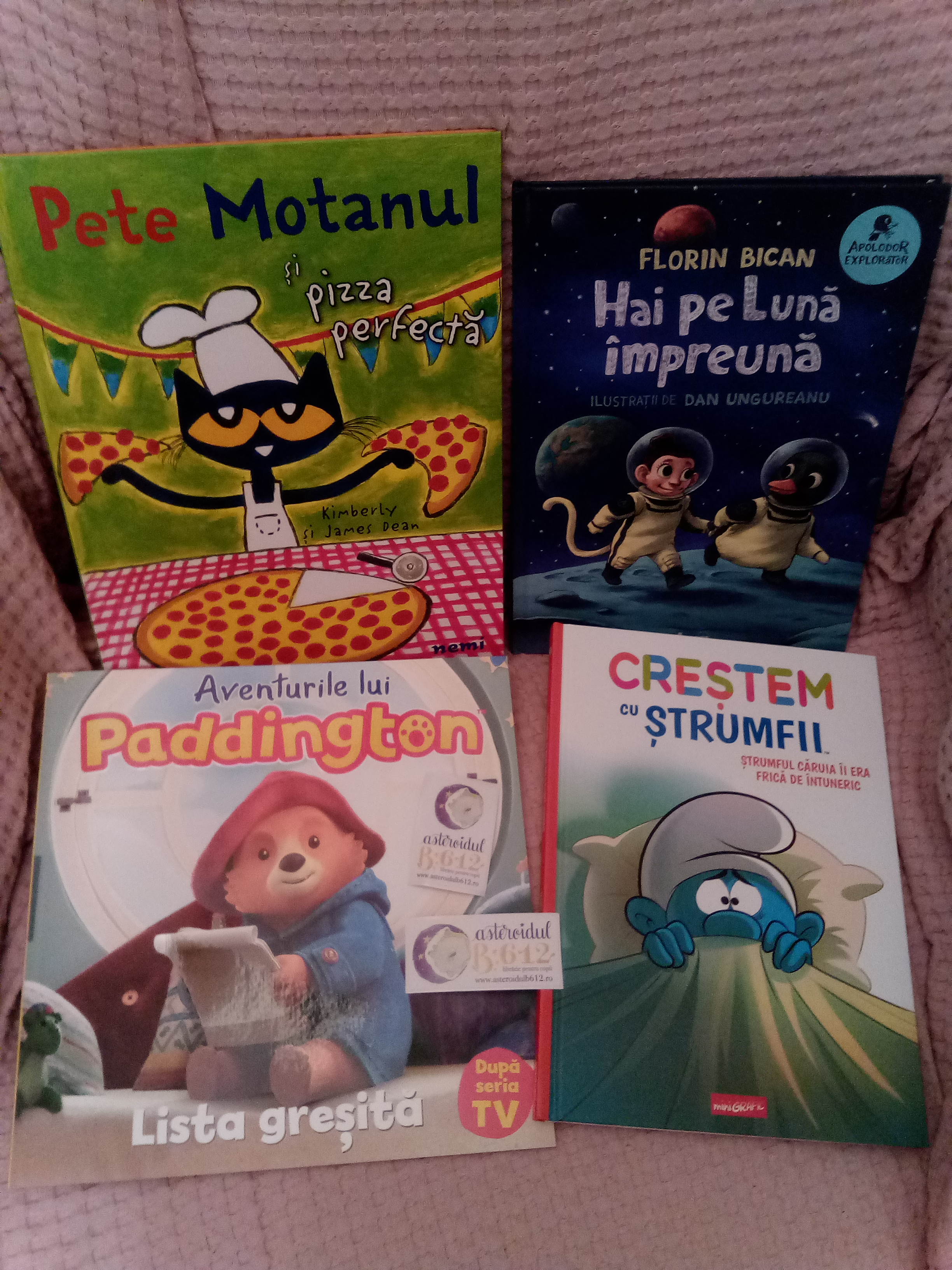 Ce am cumpărat și am citit cu Mihai acasă: Creștem cu Ștrumfii: Ștrumful căruia îi era frică de întuneric (prima bandă desenată cu aceste personaje pe care o luăm, are în plan toată seria!), Aventurile lui Paddington. Lista greșită (după seria TV), Hai pe Lună împreună de Florin Bican și Dan Ungureanu (din seria „Apolodor Explorator”, în care ilustratorul s-a întrecut pe sine, iar autorul a avut niște idei tare simpatice, cum ar fi, reprezentarea fazelor Lunii prin biscuiți Oreo) și Pete Motanul și pizza perfectă de James Dean și Kimberly Dean.