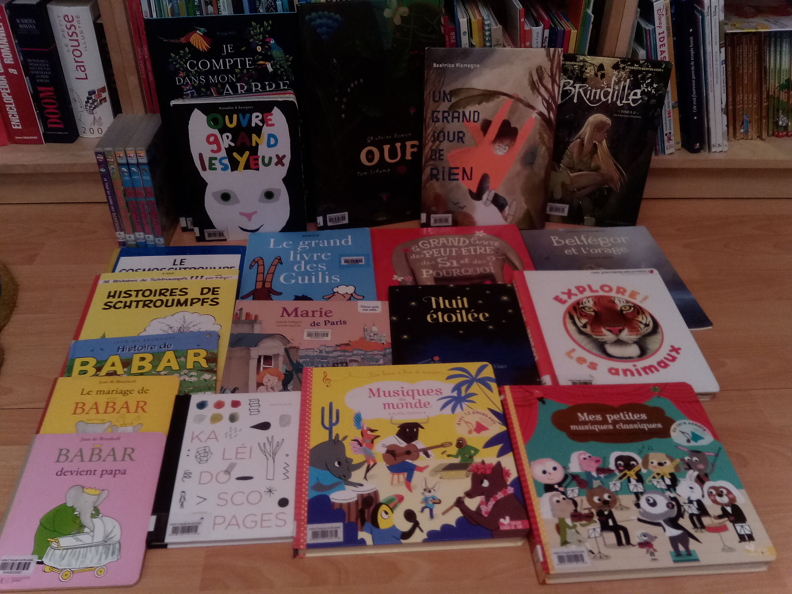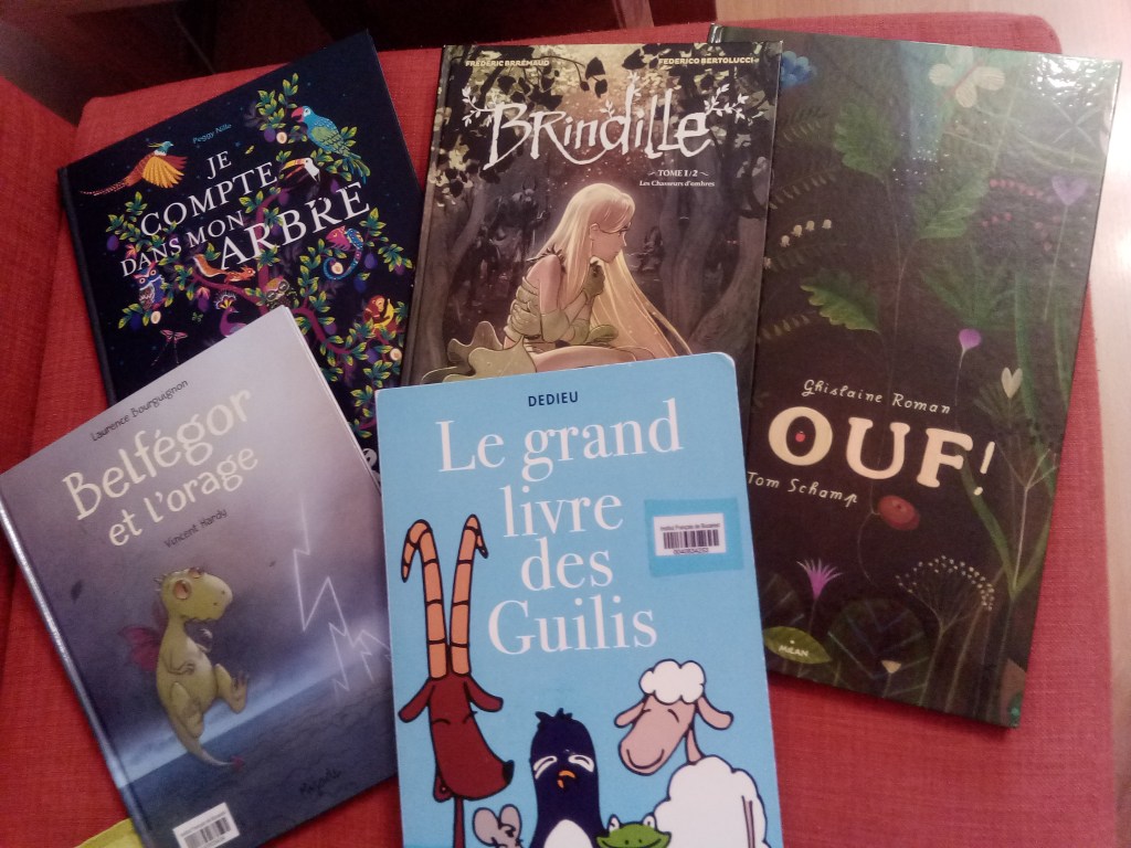 În altă zi am citit Le grand livre de guilis de Thierry Dedieu (care l-a amuzat foarte tare încă de la Institut), Belfégor et l’orage de Laurence Bourguignon și Vincent Hardy, Ouf! de Ghislaine Roman și Tom Schamp, Brindille: Les chasseurs d’ombres de Frédéric Brrémaud și Federico Bertolucci (o bandă desenată cam întunecată și sângeroasă pe care el a insistat să o luăm, care însă e primul volum dintr-un duo și nu știu dacă au și continuarea la Institut…) și Je compte dans mon arbre de Peggy Nille.