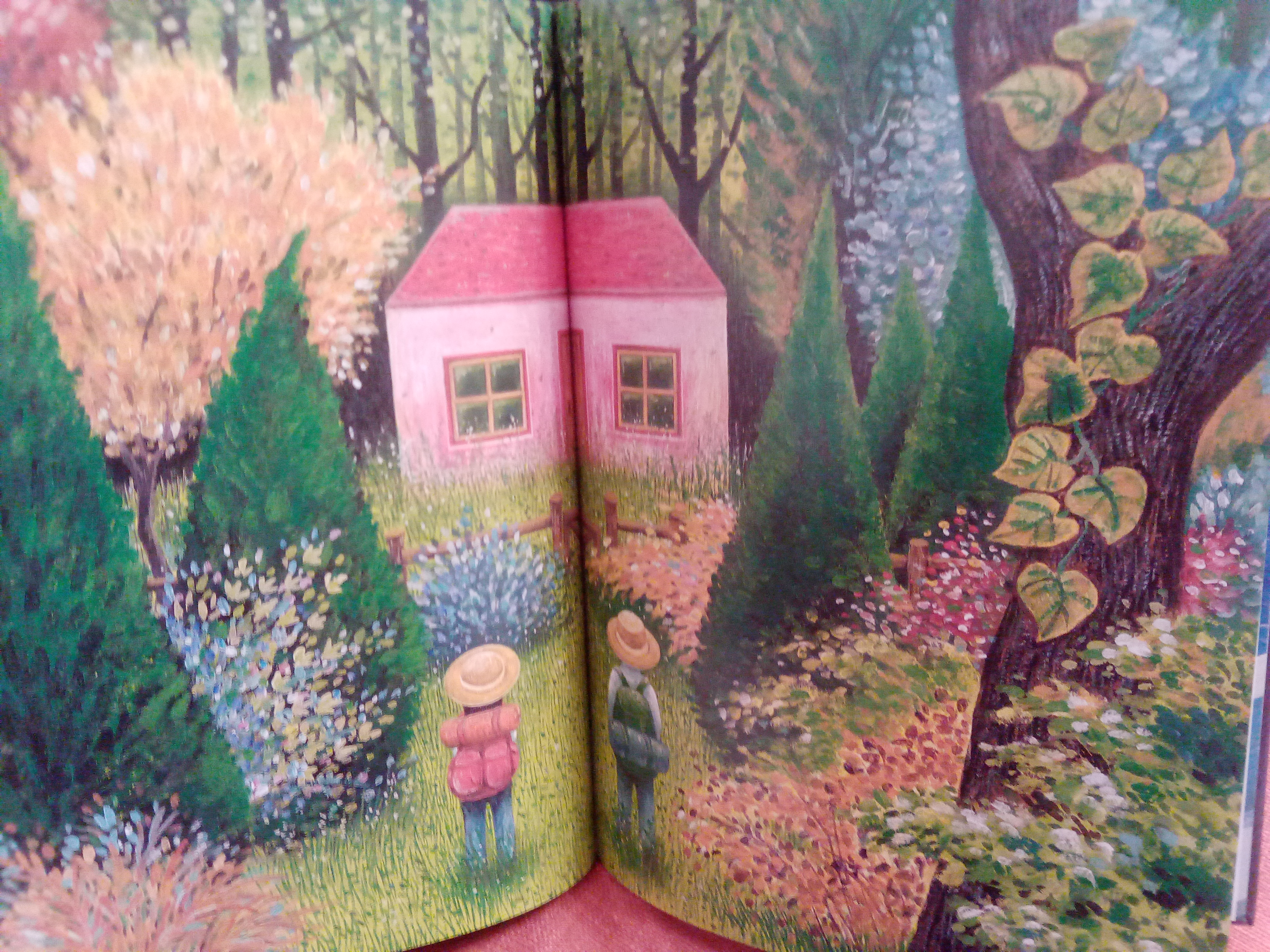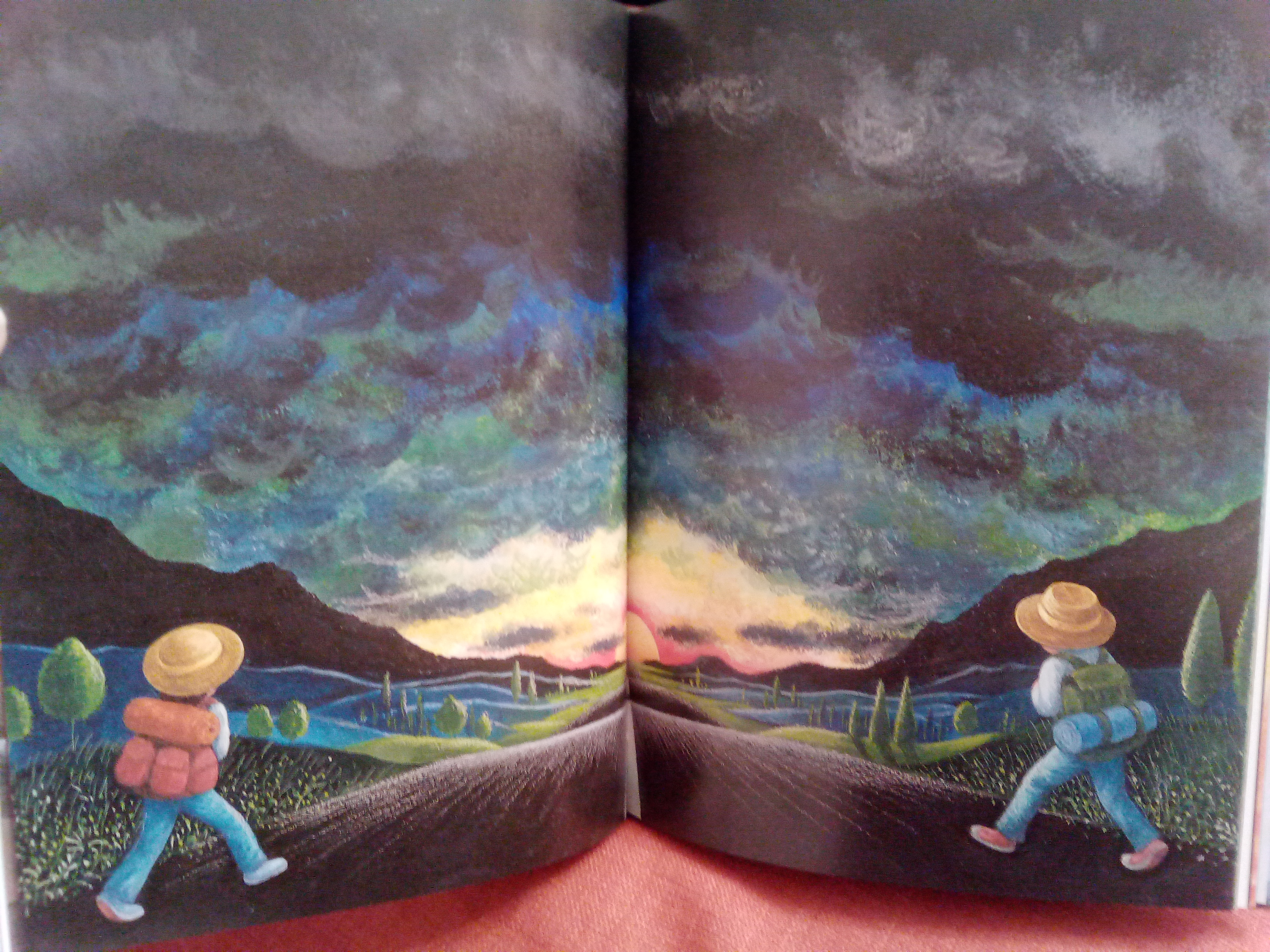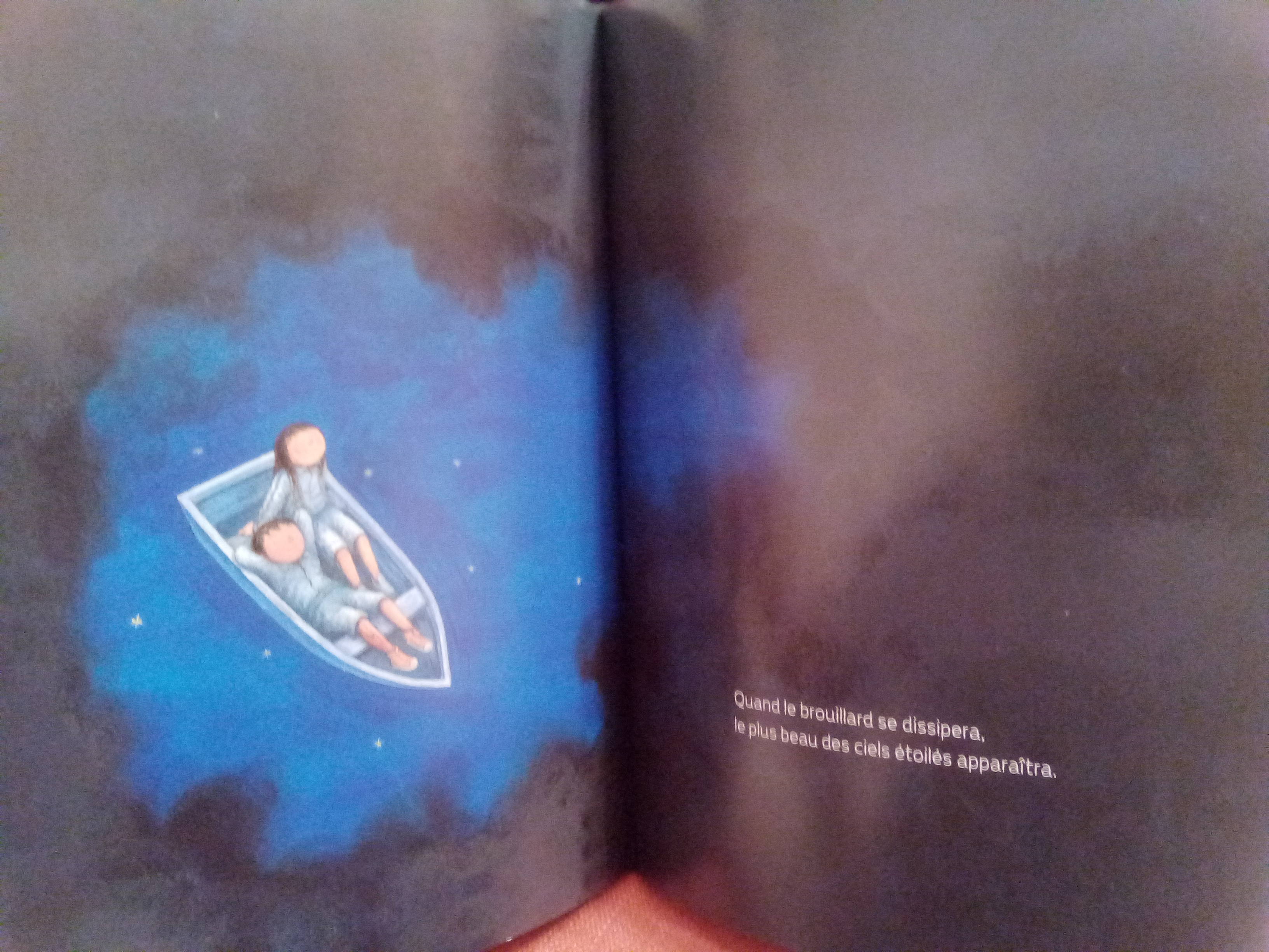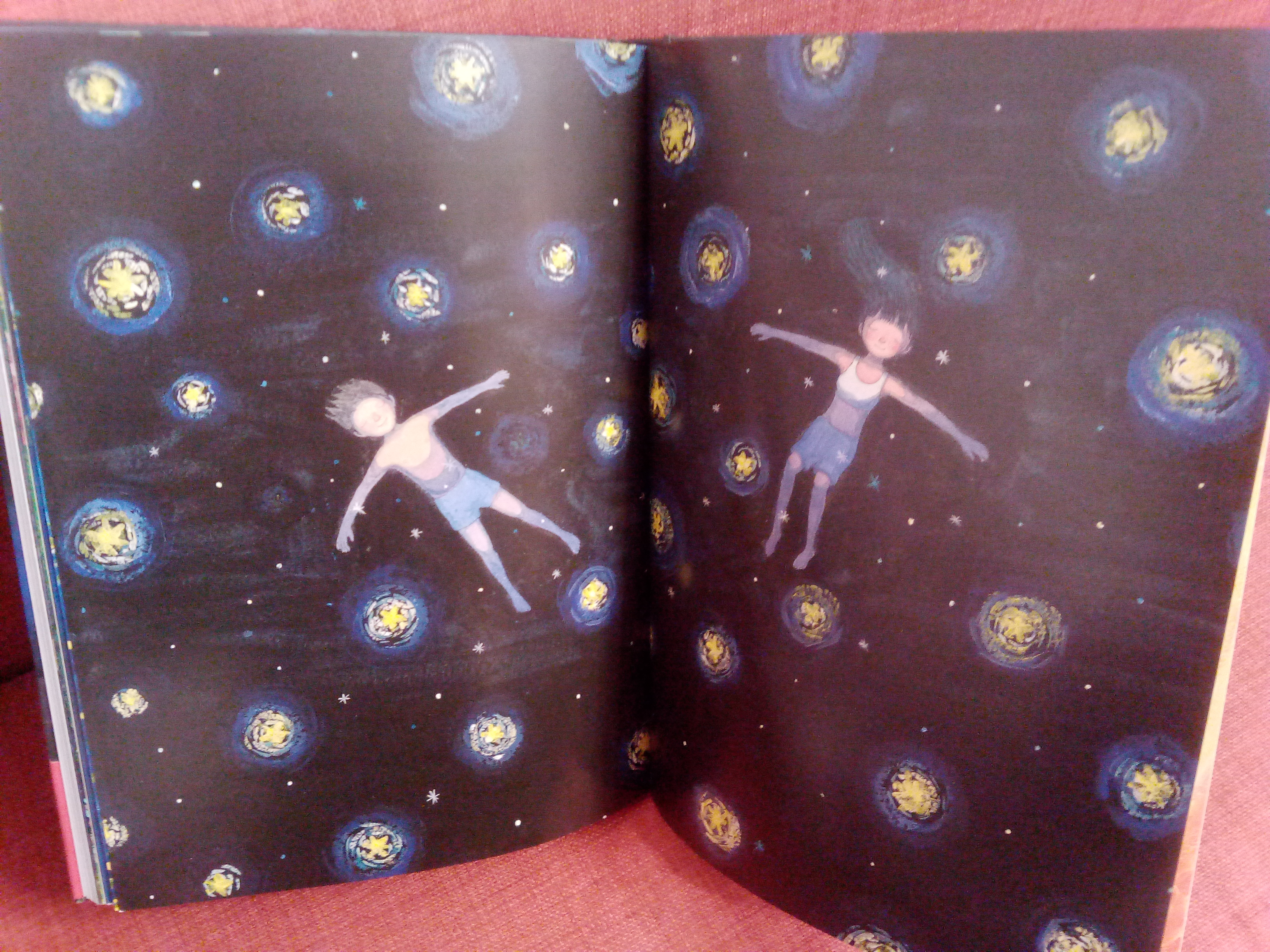 În ziua următoare am citit alte două cărți alese de mine, Un grand jour de rien de Beatrice Alemagne (tradusă și în română cu titlul Ce faci când nu faci nimic, pe care de-asta am și luat-o, pentru că am vrut să văd cum e înainte să o cumpăr) și Nuit étoilée de Jimmy Liao, o carte premiată minunată, scrisă și ilustrată de un taiwanez, despre singurătate și dorința de apartenență, din care am ținut să vă arăt câteva dintre ilustrațiile superbe (deși pozele mele nu redau nici pe departe culorile extrem de vii ale acestora).