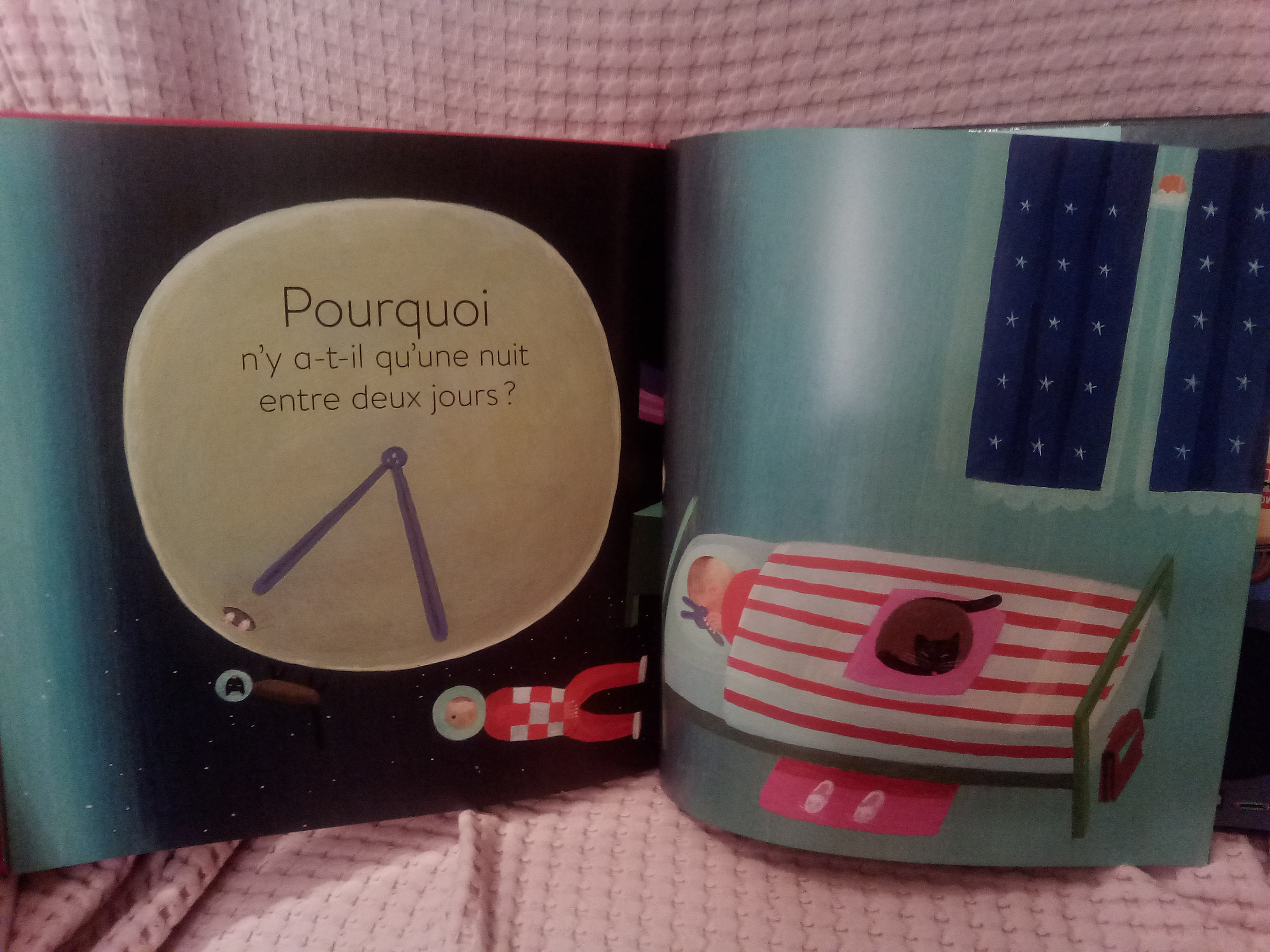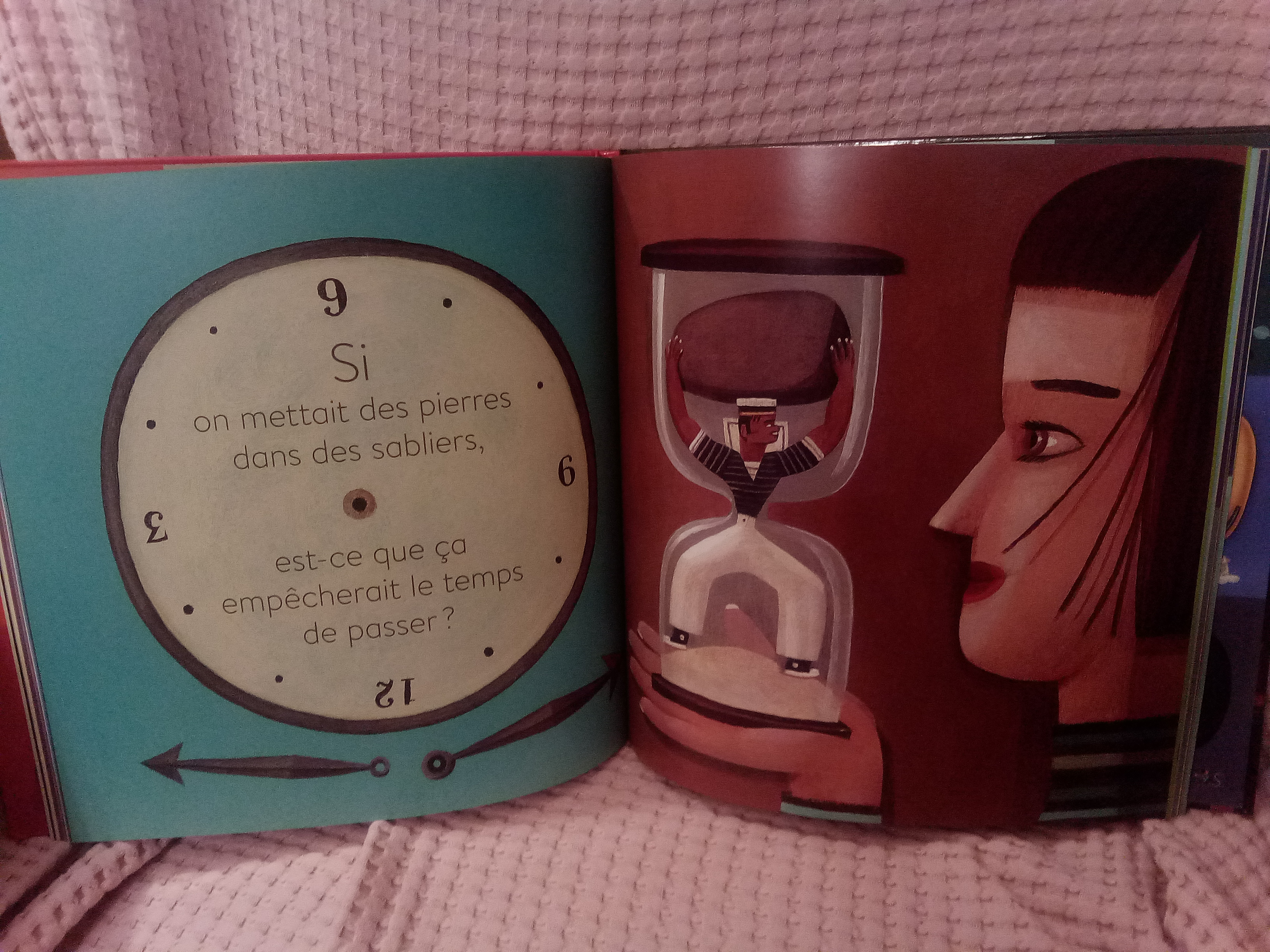 Primele pe care le-am citit au fost Kaléidoscopages de Delphine Perret (care ne-a plăcut foarte mult, dar care mi-ar fi greu să spun ce e, propune diferite cuvinte care ar putea descrie aceleași reprezentări grafice sau progresii de ilustrații, e un fel de mini introducere în artă, dar și un fel de vocabular, e ceva inedit și foarte captivant), cărțile mici cu Babar, cele muzicale și Le Grand Livre des peut-être, des si et des pourquoi de Ghislaine Roman și Tom Schamp. Pe aceasta din urmă eu am ales-o și mi-a plăcut foarte mult, pentru că lansează niște întrebări creative și am pozat câteva să vă arăt: Dacă am pune pietre în clepsidre, asta ar împiedica timpul să treacă? De ce nu există decât o noapte între două zile? (Chiar așa!) De ce trebuie să se termine cărțile? Poate pentru plăcerea de a le reîncepe.
