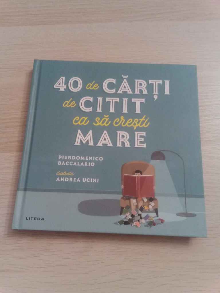 După aceea, am citit 40 de cărți de citit ca să crești mare de Pierdomenico Baccalario, cu ilustrații de Andrea Ucini, o selecție de recomandări de cărți pentru copii, care să le insufle dorința de a citi (și mai mult). Mi-a plăcut modul ludic și inedit în care prezintă cărțile, face un fel de fișe de lectură schematice, în care include câte un citat-cheie, detalii din viața autorului sau care au legătură cu scrierea operei respective și face legături cu alte cărți în același gen sau cu filme care abordează aceeași temă.