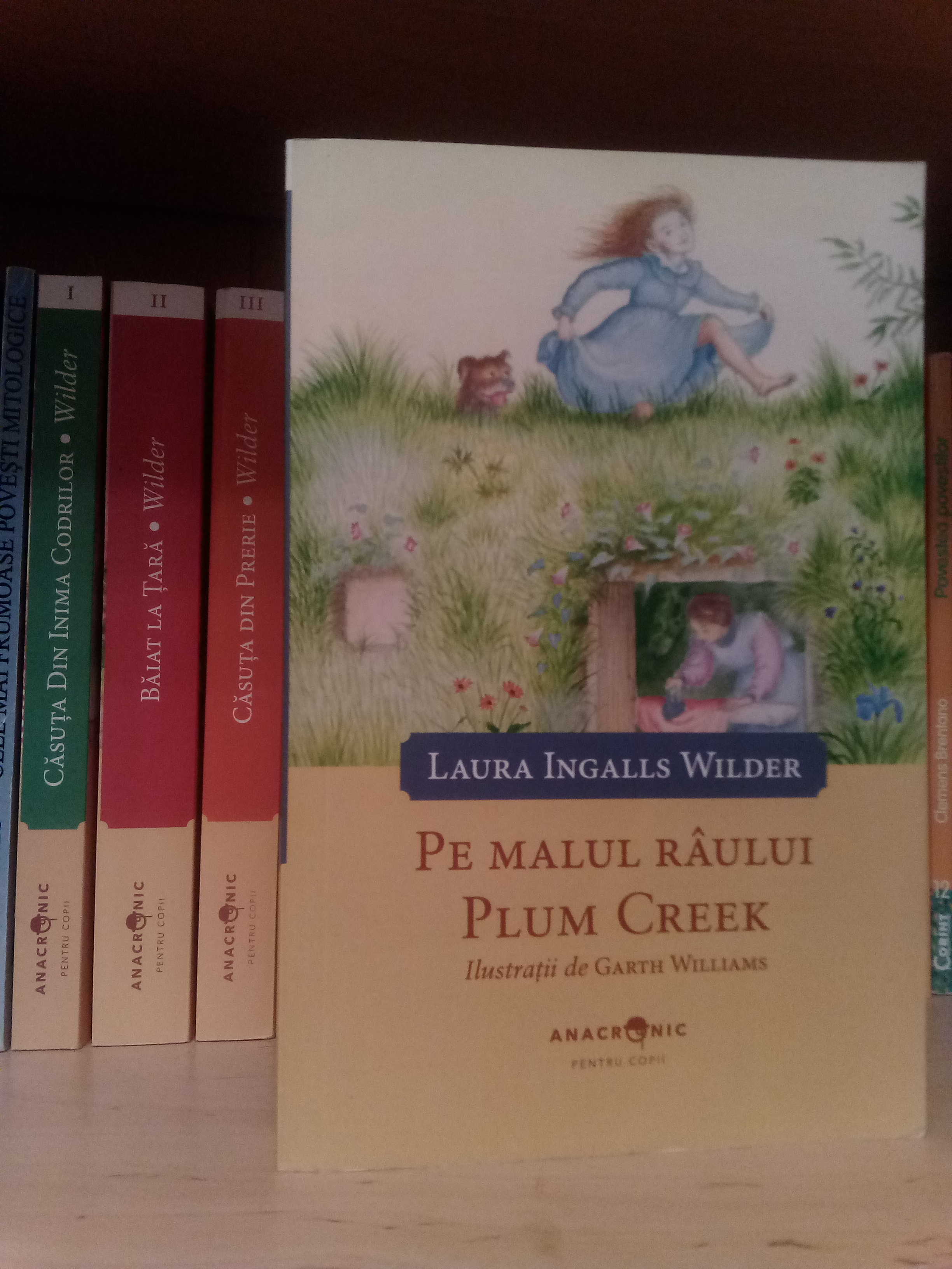 Am terminat apoi în sfârșit volumul 4 din seria „Căsuța din prerie”, Pe malul râului Plum Creek de Laura Ingalls Wilder, în care în sfârșit se întâmplă și niște lucruri mai palpitante. Familia Ingalls se mută într-o casă de pământ pe malul unui râu până au suficiente resurse pentru a construi o casă pe terenul respectiv. Fetele cele mari se duc pentru prima oară la școală, recolta de grâu cu care aveau planuri mari este distrusă de o invazie de lăcuste și au parte de 4 zile la rând de viscol care îl împiedică pe tatăl lor să ajungă acasă.