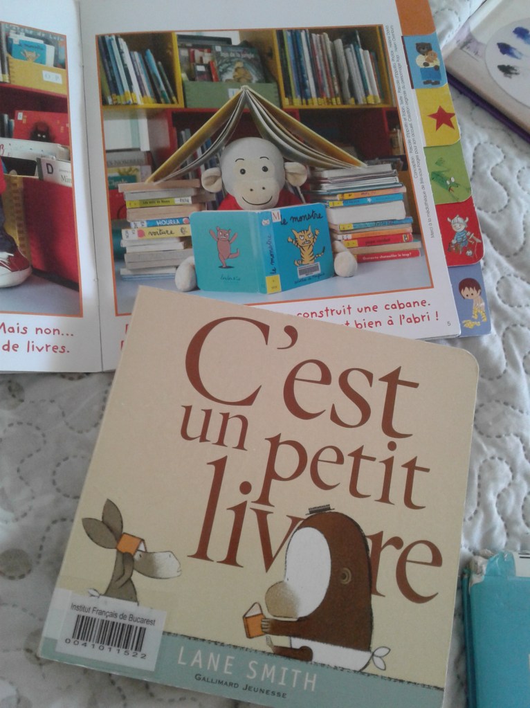 Este o carte de Lane Smith – o carte care-ţi arată într-un mod amuzant ce este… o carte. Eu am citit-o în franceză în Librăria Kyralina înainte de a-l avea pe Mihai, iar lui i-am citit-o inițial tot în franceză, în varianta boardbook un pic prescurtată, împrumutată de la Institutul francez. Abia mai târziu am găsit-o în română la biblioteca de cartier, iar cât am avut-o în franceză i-am citit-o atât de des și o răsfoia atât de mult încât o învățase pe de rost. Iată aici dovada (de la aproape 3 ani și 5 luni)!