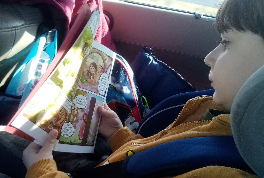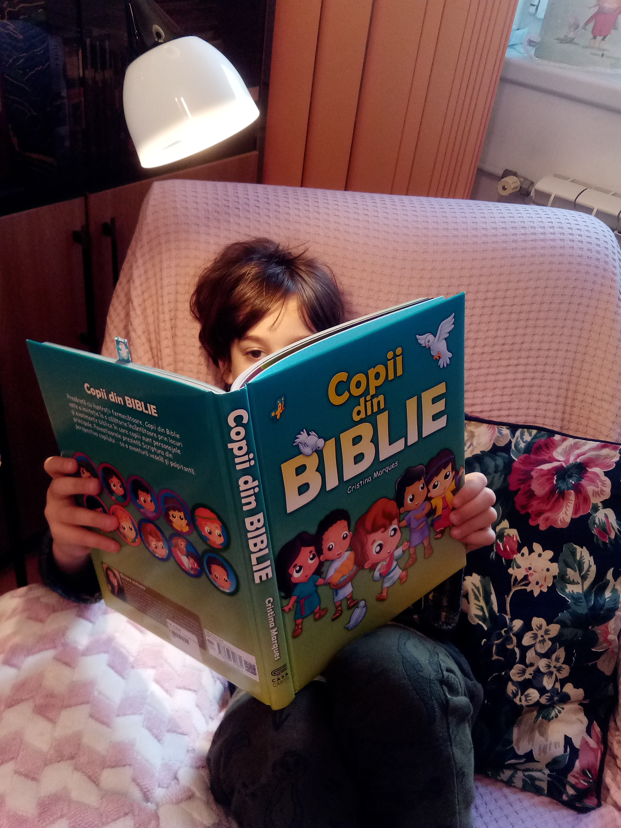 La sfârșitul lui ianuarie, pentru că îi promisesem că după ce termină o carte de activități biblice pe care o începuserăm încă de anul trecut, o să-i iau o Biblie pentru copii pe care și-o dorea foarte mult și pe care zicea că o va citi singur, ne-am dus la Stephanus și am cumpărat-o.