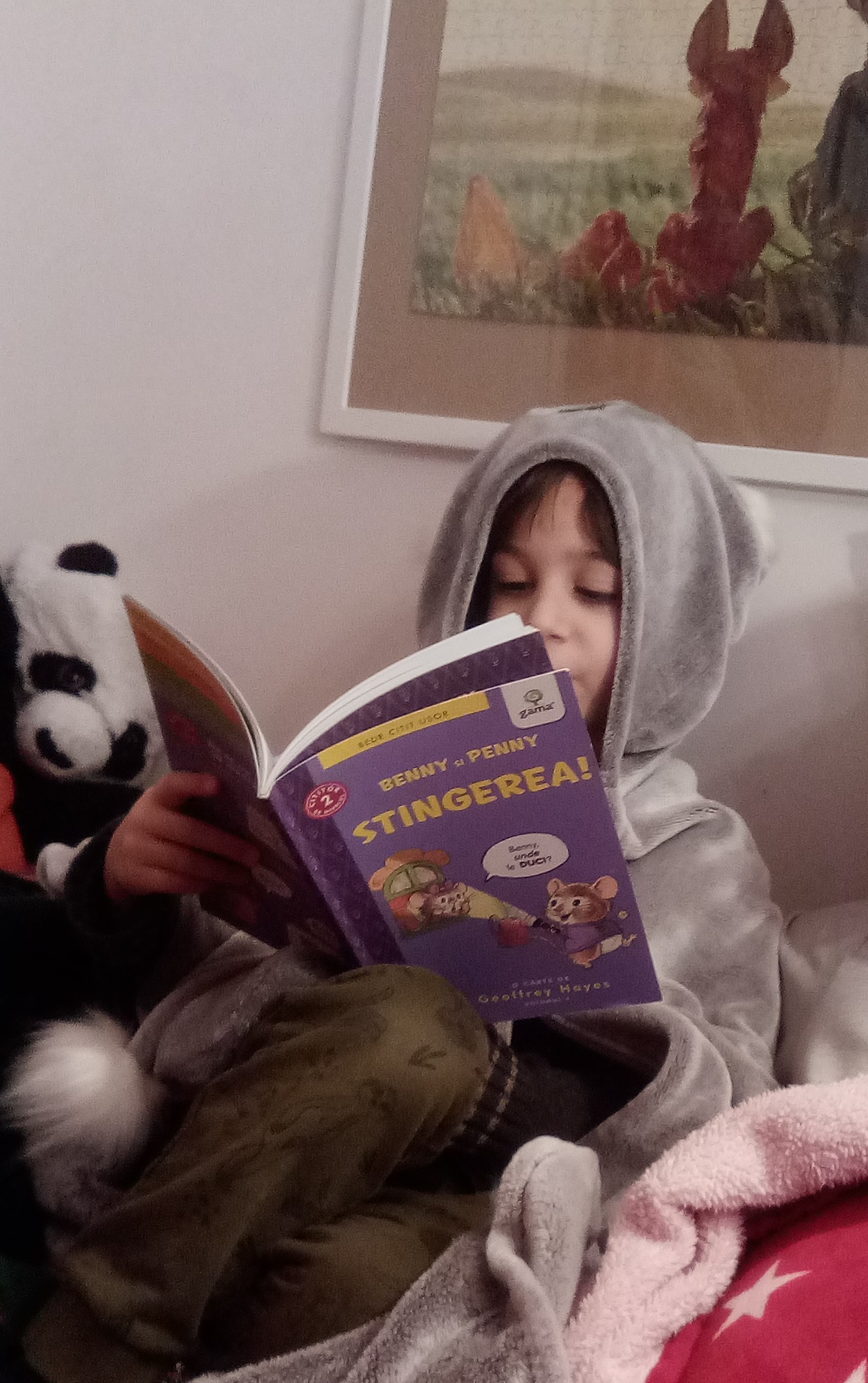 Asta până i-a luat Nana (mama mea) prima carte din seria cu Benny și Penny de Geoffrey Hayes, o colecție clasică, premiată de altfel, tot în format de bandă desenată, care a devenit curând favorita lui. Treptat i le-a cumpărat pe toate și le-a citit deseori, îi plăcea să le citească cu intonație și voci diferite (ajută și grafia cu bold, litere de diferite mărimi, semne de exclamare etc) și să ni le citească și nouă.