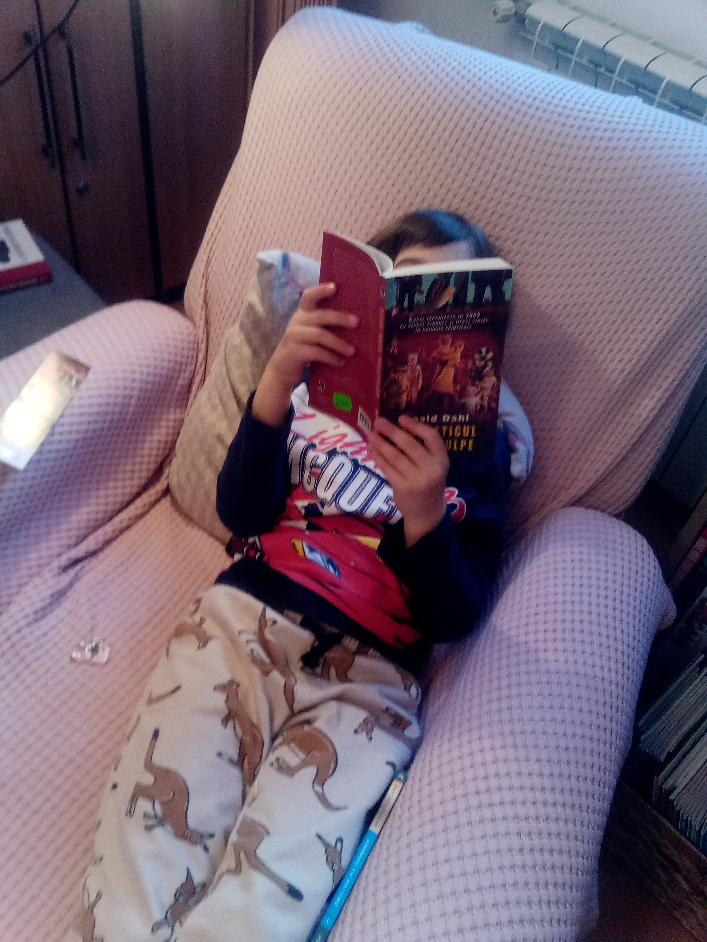 Din seria „ce cărți și-a mai luat Mihai singur din bibliotecă și a început să citească” urmează prima lui carte de Roald Dahl, Fantasticul domn Vulpe (într-o ediție veche și ponosită, dar orișicât!).