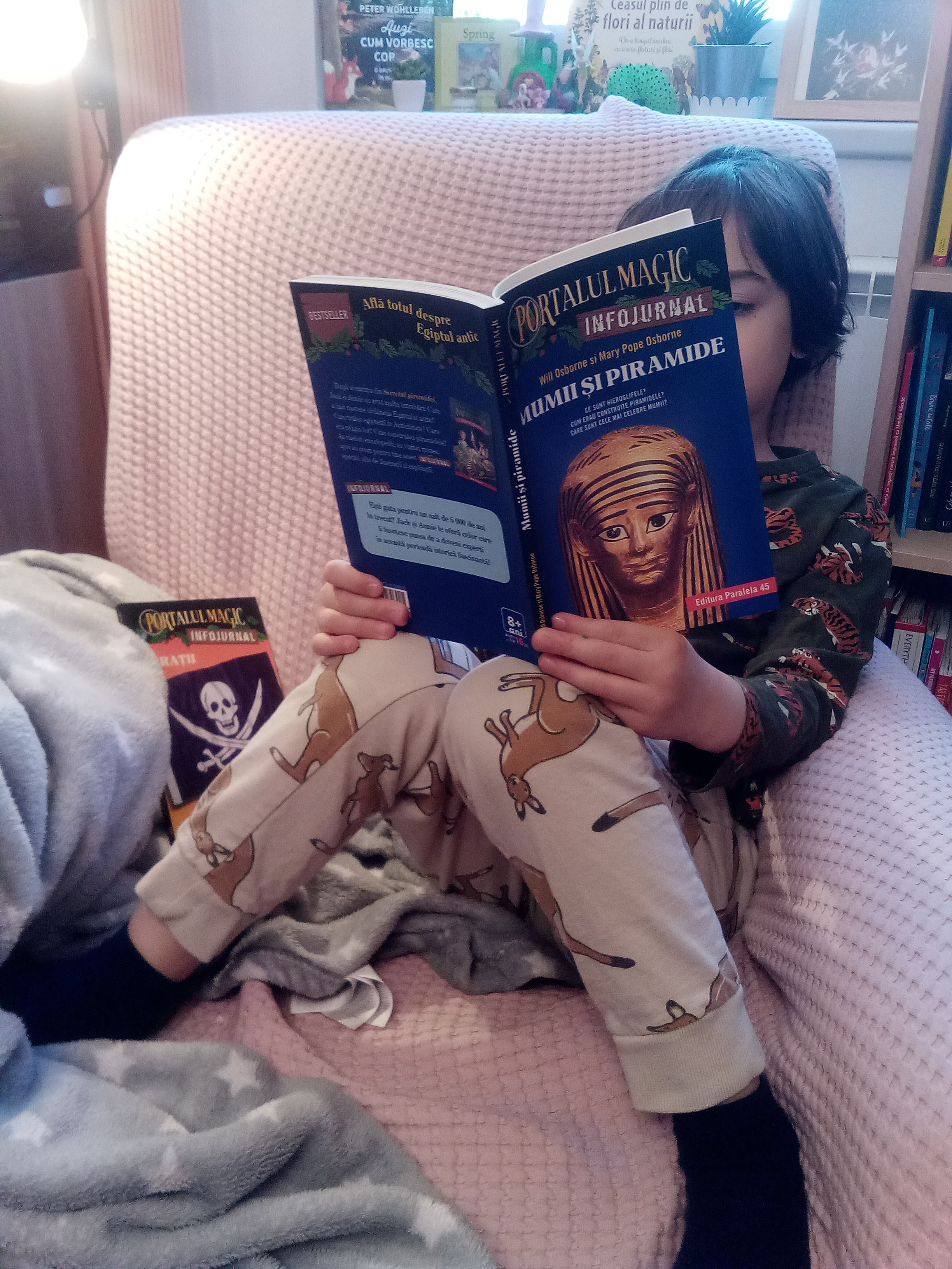El a citit deja primele 6 volume și 4 info-jurnale, și îi plac foarte mult pentru că personajele – un băiat și o fată – călătoresc în timp în diverse locuri și perioade istorice și sunt foarte palpitante. Mie mi se pare foarte fain că există și info-jurnalele din care află adevărul istoric. Acestea lui i se par mai greu de citit, deși a insistat să le aibă și să le citească (acum s-a împotmolit tocmai la cel despre samurai și ninja).