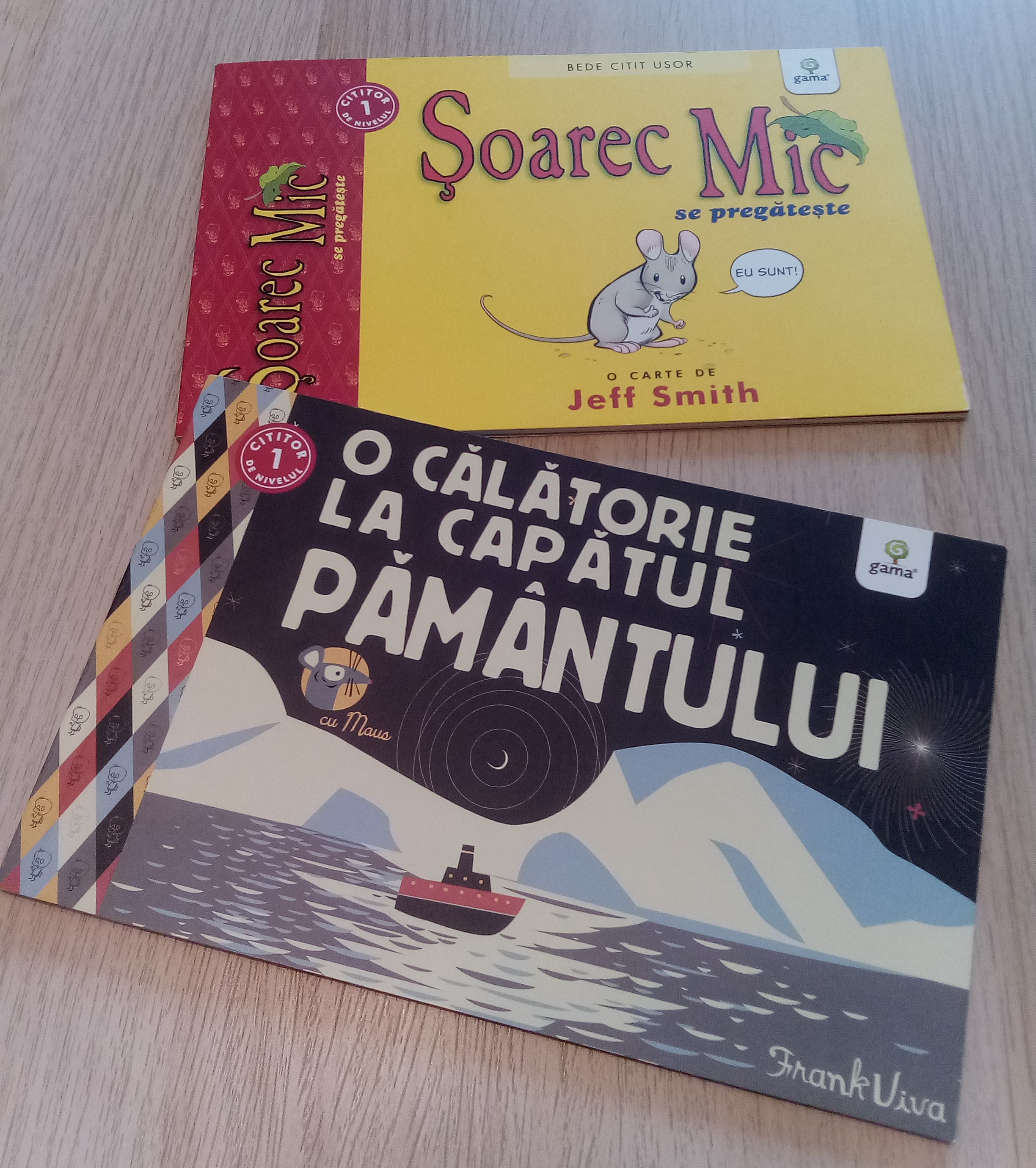 În afară de cărți din această colecție, în toamnă i-am luat două de la Editura Gama, Șoarec Mic se pregătește de Jeff Smith și O călătorie la capătul Pământului cu Maus de Frank Viva, ambele în format de bandă desenată cu majuscule într-un font ușor de urmărit și cu cuvinte puține, care au rămas printre preferatele lui mult timp.