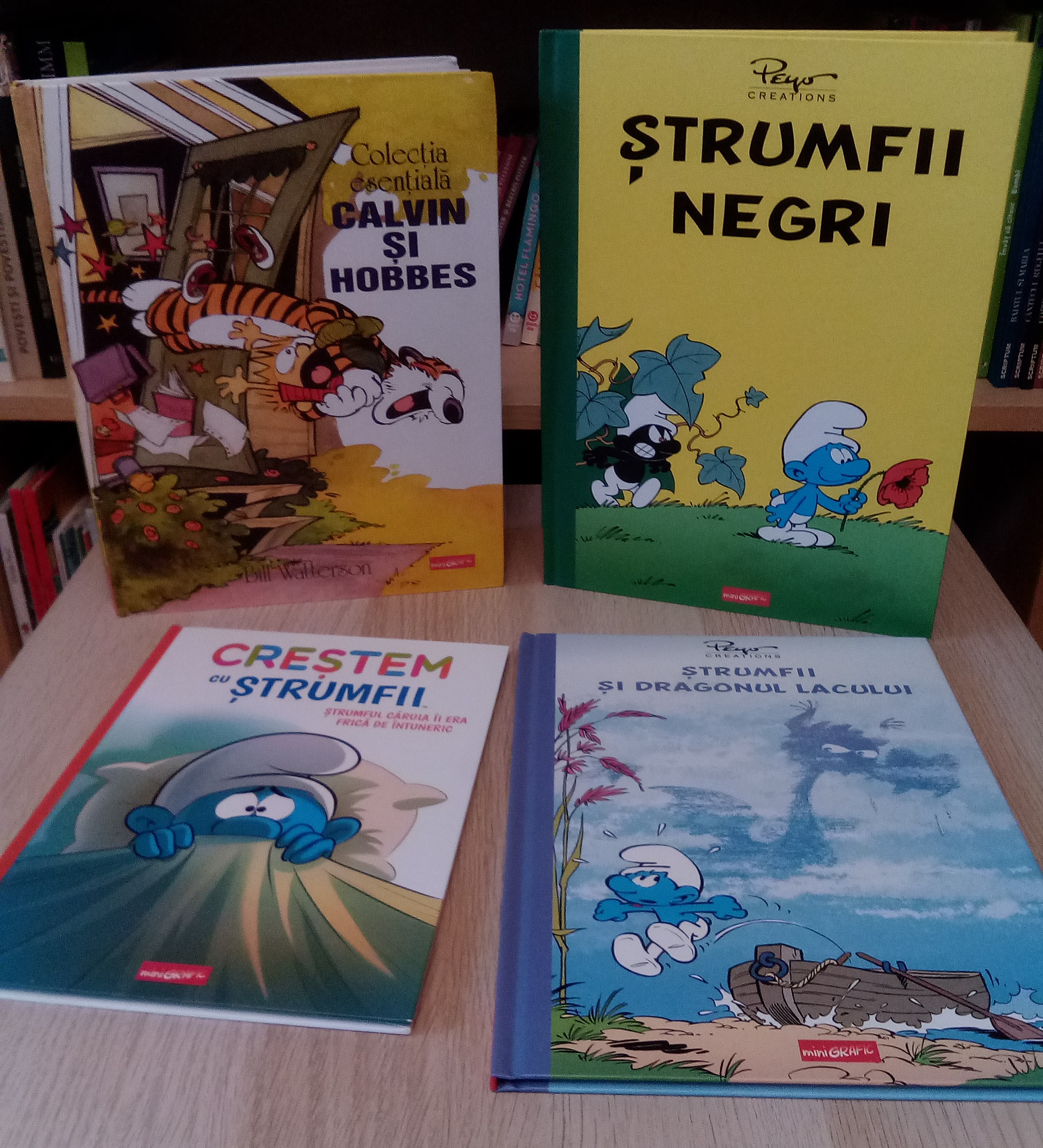 V-am spus deja că îi plac foarte mult benzile desenate, așa că nu puteau lipsi din topul lui. A ținut să includă Colecția esențială Calvin și Hobbes de Ben Watterson (despre care am scris deja aici cu exemple) și benzile desenate cu Ștrumfi, din care avem momentan trei volume, Creștem cu Ștrumfii (#1): Ștrumful căruia îi era frică de întuneric, Ștrumfii negri și Ștrumfii și dragonul lacului. Mie nu mi-au plăcut în mod deosebit Ștrumfii, dar lui i se par foarte amuzante.
