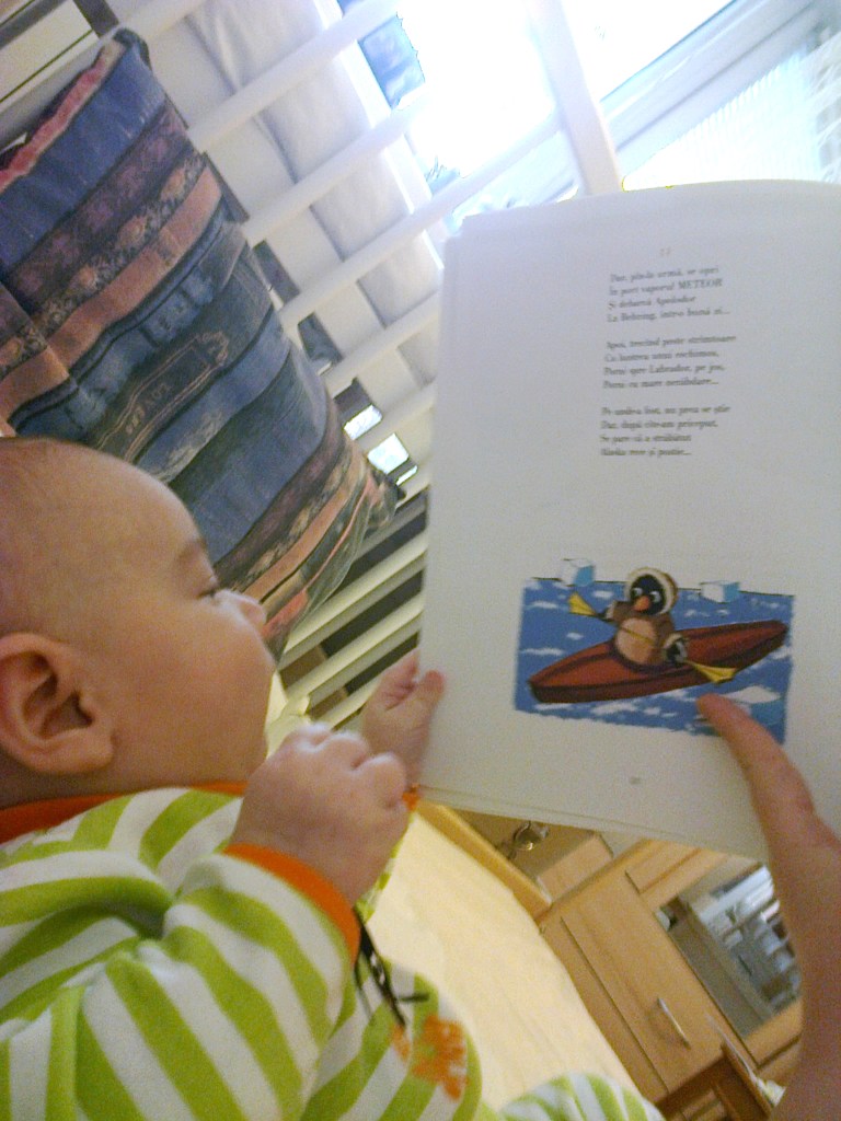 La 6 luni, copilul e mai interesat să atingă și să prindă cartea ca s-o ronțăie. Numai eu știu câte cărți „a distrus” Mihai în acest mod (de aceea nici nu mai avem Omida mâncăcioasă :)) ), așadar sunt recomandate cărțile cartonate, plastifiate (cum sunt cele din colecțiile Larousse de la Rao, care chiar nu se rup și pot fi și șterse dacă se murdăresc), din burete sau cauciuc (pentru baie).