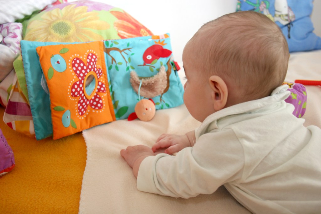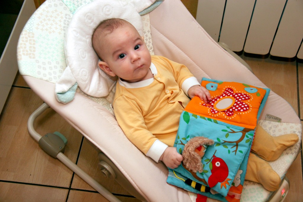 La vârsta de 4 luni bebelușul este deja treaz perioade mai lungi de timp și mai alert, dar este încă un ascultător pasiv. Îl vor atrage însă culorile vii și constrastul alb-negru, sunetele clar diferențiate, orice fel de foșnete, chițăieli și texturile diferite.