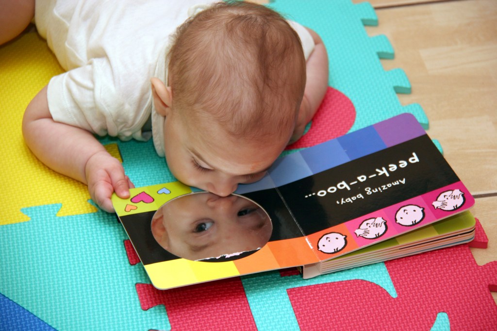 Prima lui carte preferată, care din păcate nu se mai găsește, a fost o carte în engleză, Peek-a-Boo Baby (seria Amazing Baby) de Emma Dodd. Eu am cumpărat-o de la un târg de carte și a fost prima care l-a atras cu adevărat când avea vreo 7-8 luni și pe care a „studiat-o” îndelung. O carte cartonată, cu clapete și oglindă la final, despre senzațiile bebelușilor, despre care am scris pe larg aici.