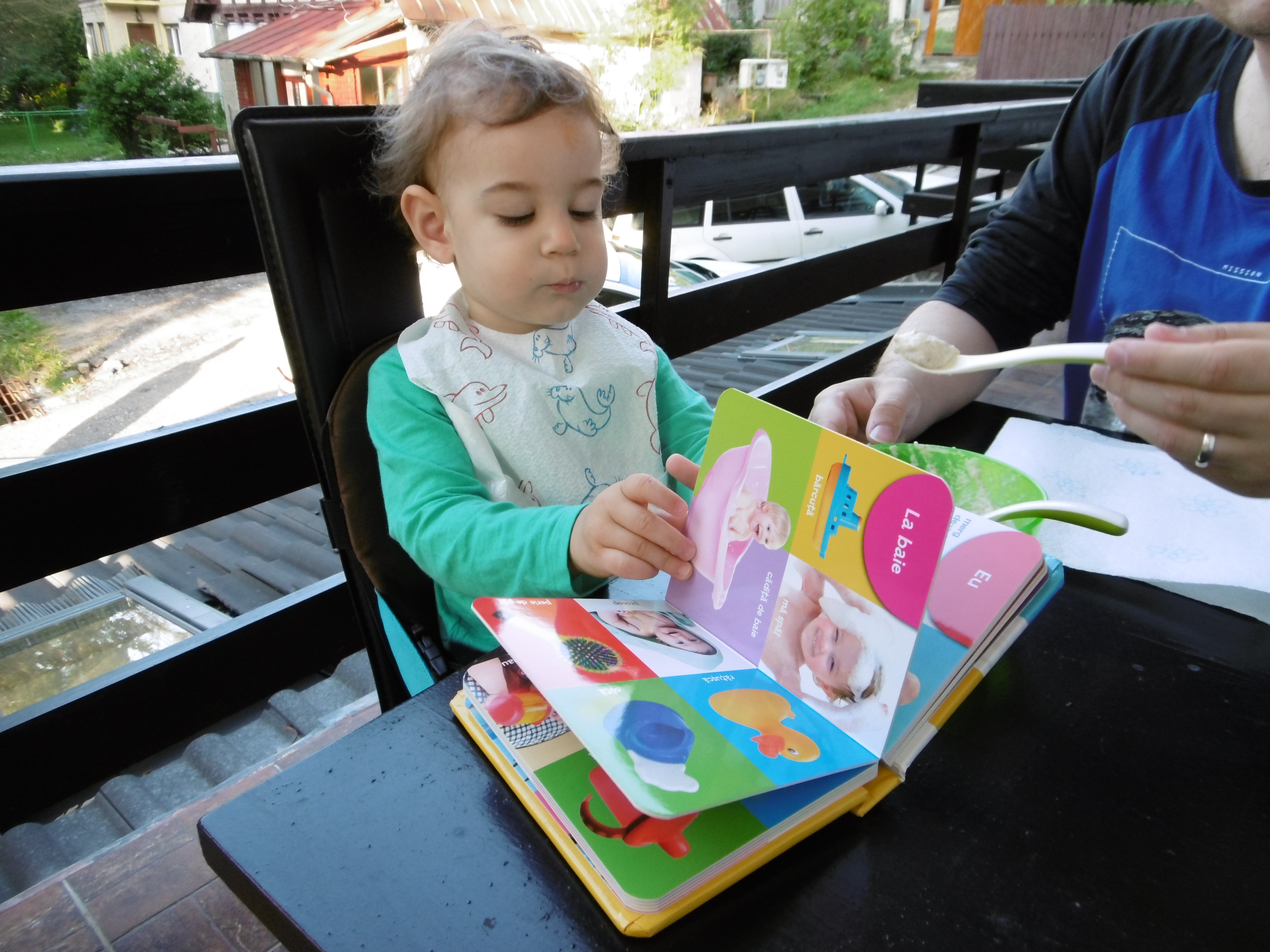 Prima etapă a achiziției limbajului este „etichetarea mediului”, de aceea le citim bebelușilor cărți cu ilustrații și cuvinte care să le construiască vocabularul de bază, cum ar fi Primele 100 de cuvinte, pe care am avut-o și noi. Ideal ar fi ca acestea să conțină fotografii ale obiectelor reale pentru a face ușor corespondența cu realitatea. Chiar dacă par plictisitoare de citit (pentru că nu conțin o poveste), ele sunt esențiale la început când intervalul de atenție nu este mare, dar gradul de absorbție a limbajului este.