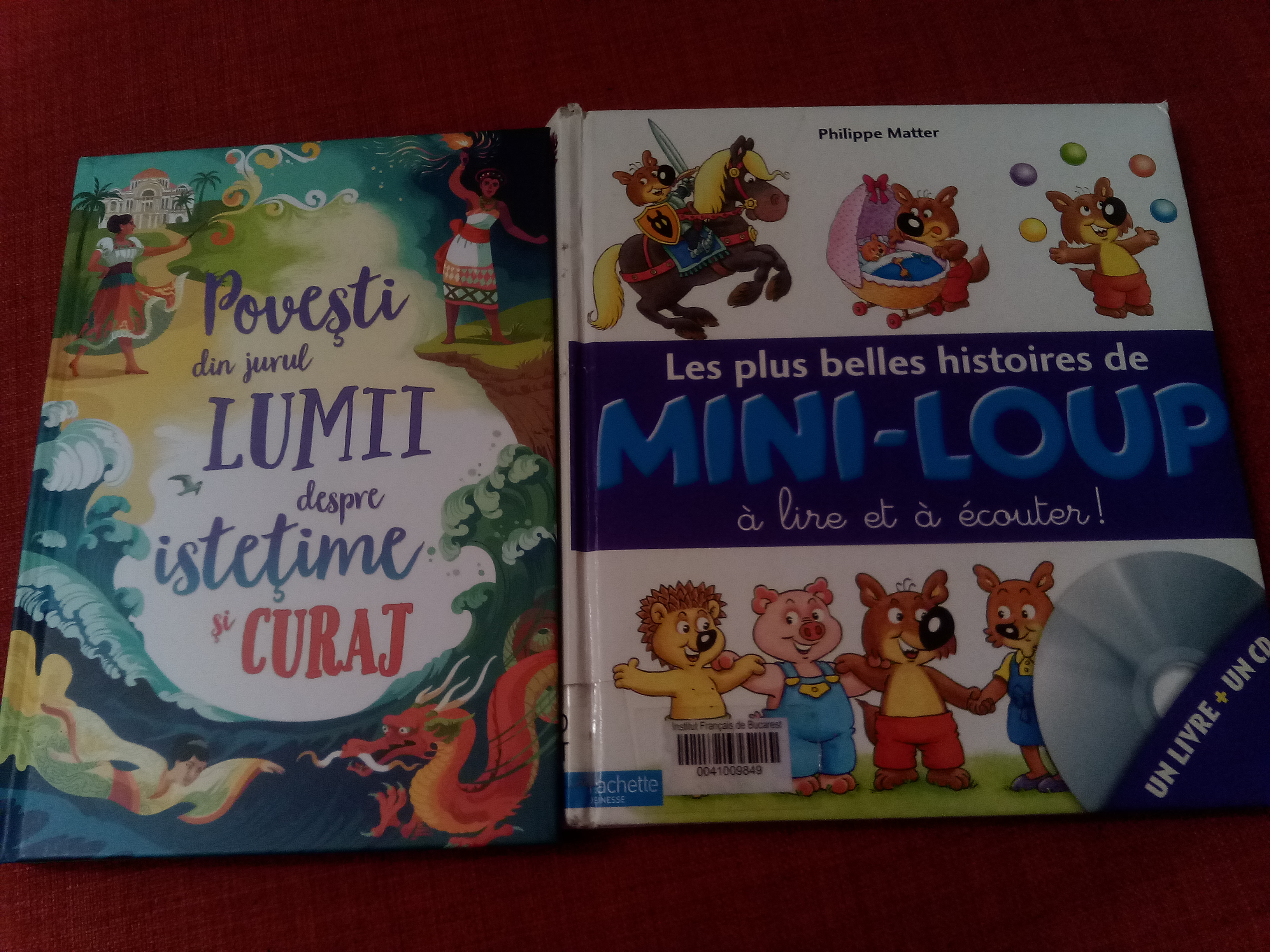La începutul lunii i-am citit lui Mihai cărțile împrumutate de la Institutul francez: Les couleurs de Lili de Lucie Albon (în română, Culorile lui Lili), T’choupi range sa chambre de Thierry Courtin, Oui-Oui: En voiture!, Oui-Oui aide Souriceau și Oui-Oui: Un vélo neuf pour Potiron de Enyd Blyton, Les animaux de Lou: Tu grandiras petit girafon! de Mymi Doinet și Mélanie Allag, Les docs de Lou: Tout sur les loups! de Mymi Doinet și Mélanie Allag, Le Mouton qui n’arrivait pas à s’endormir (în română, Oaia care nu putea să doarmă) și Le zèbre qui ne voulait pas aller à l’école (în română, Zebra care nu voia să meargă la școală) de Christine Beigel și Hervé Le Goff (chiar haioase!), Mini-loup fait les 400 coups și Mini-Loup au poney-club de Philippe Matter.