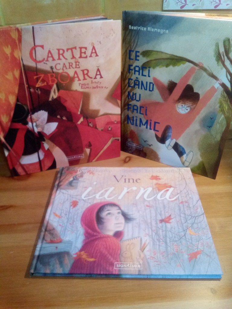 Am făcut apoi o comandă la Editura Signatura pentru că aveau niște noutăți care mi-au făcut cu ochiul și am citit Vine iarna de Tony Johnston și Jim LaMarche, o carte superb ilustrată despre natura care se pregătește de iarnă, din septembrie până la prima zăpadă și Cartea care zboară de Pierre Laury și Rebecca Dautremer, care m-a atras prin titlu și ilustratoare (care a ilustrat minunata Prințese date uitării sau necunoscute). (Ce faci când nu faci nimic o citiserăm în franceză de la Institut mai demult, iar acum am decis să o cumpăr pentru că Mihai seamănă cu băiețelul de pe copertă până la ochelarii cu ramă albastră!)