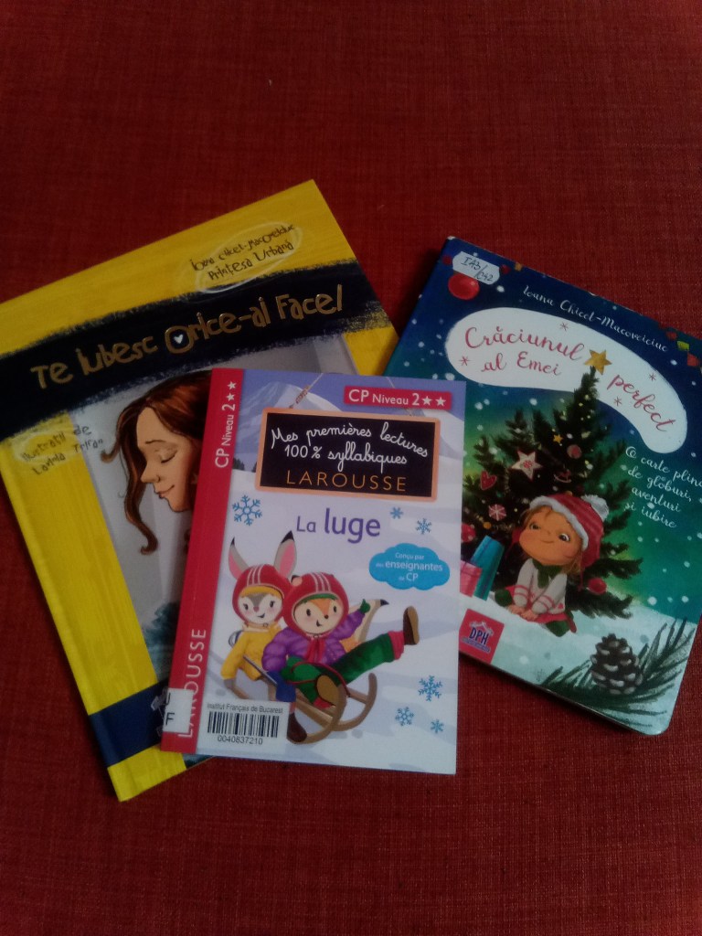 Spre sfârșitul lunii am făcut din nou o vizită la biblioteci și am citit o carte la Institut, Dessine-moi un petit prince de Michel Van Zeveren și i-am citit lui Mihai acasă Crăciunul perfect al Emei de Ioana Chicet-Macoveiciuc (care are o atmosferă foarte caldă și dulce) și Mes Premières lectures 100 % syllabiques: La luge de Giulia Levallois, Hélène Heffner și Cécilia Stenmark.