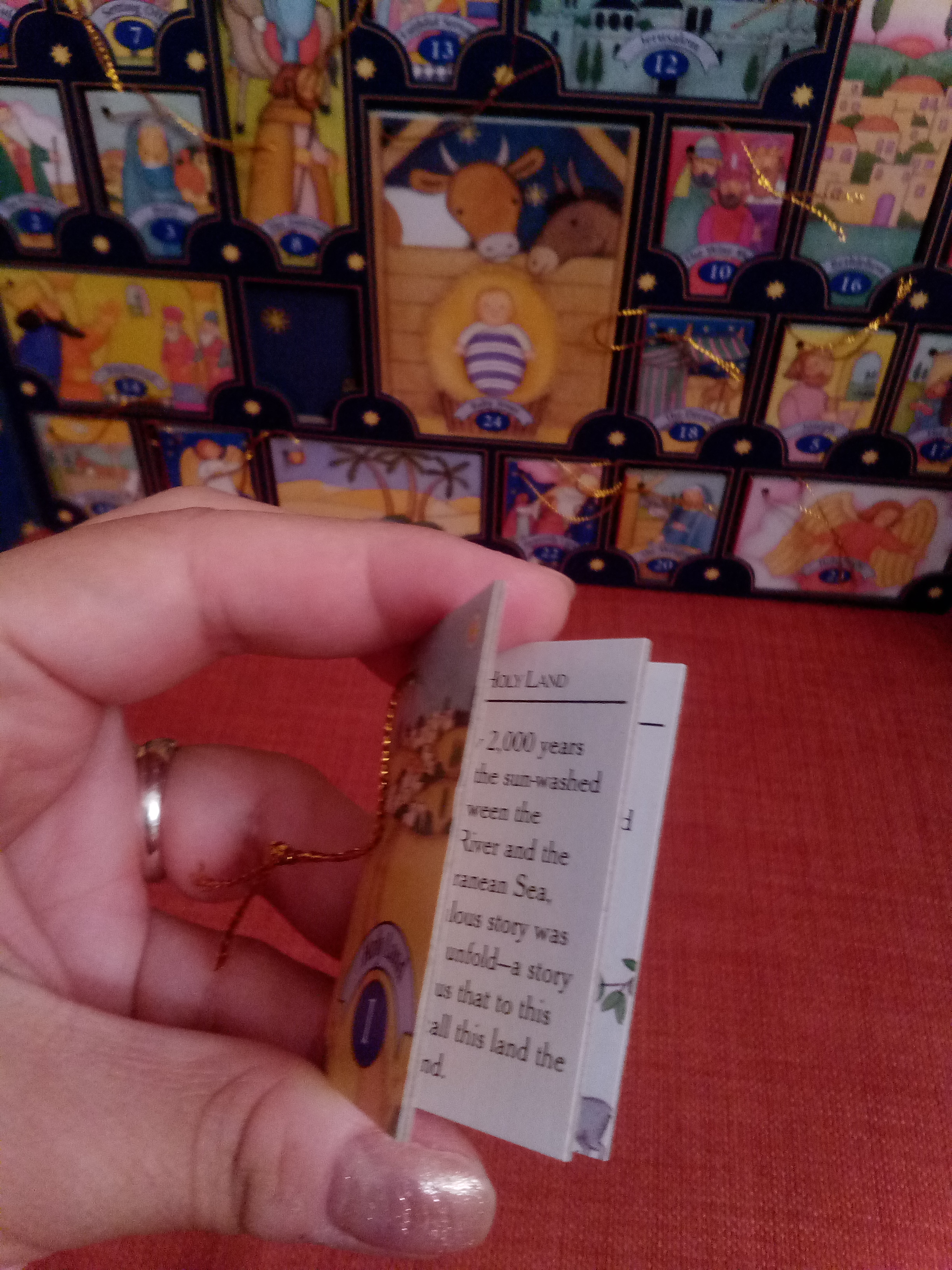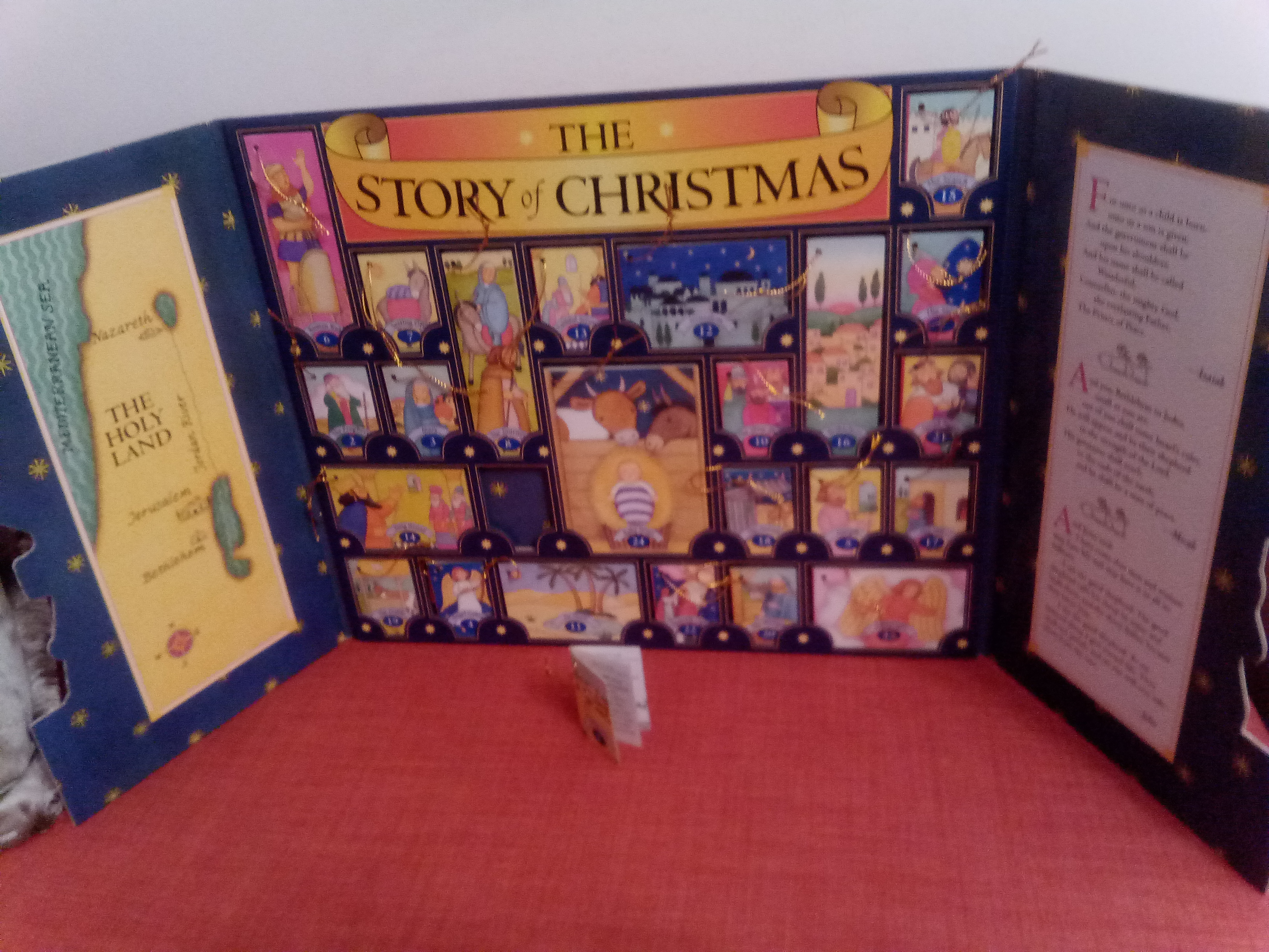 În final, sperând că nu e prea târziu, vreau să vă arăt și ce calendar de Advent am cumpărat anul acesta pentru Mihai. Este vorba despre The Story of Christmas Story Book Set & Advent Calendar [With 24 Miniature Story Books], o colecție de 24 de cărticele în miniatură ce pot fi atârnate în brad pe măsură ce sunt descoperite (au mici agățători aurii). Iată câteva poze pe care am apucat să le fac înainte să-l ascund.