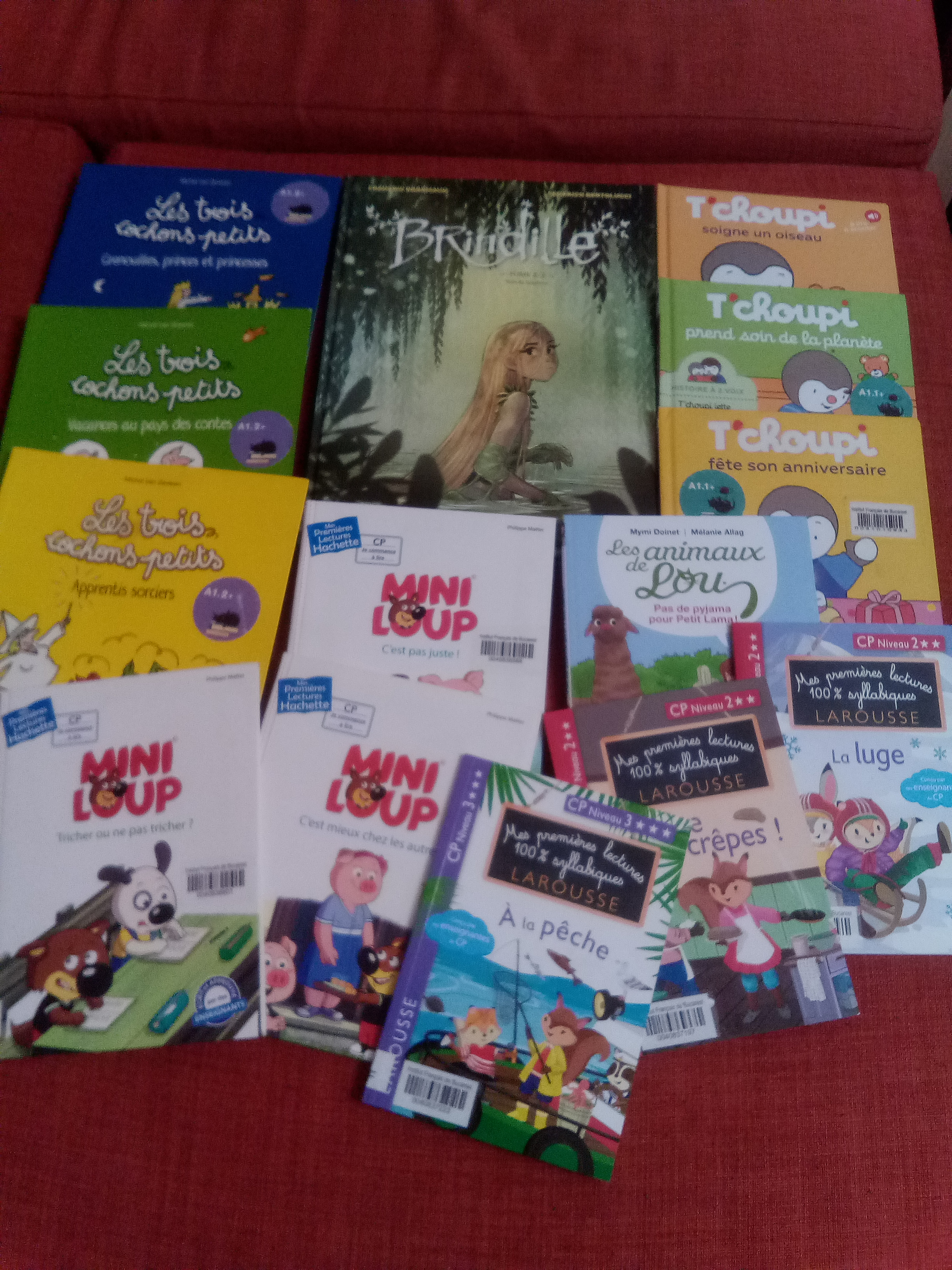 De la Institutul francez am citit luna aceasta Brindille: Vers la lumière (vol. 2) de Frédéric Brrémaud și Federico Bertolucci (prea sângeroasă și neclară), Les trois cochons petits #3 – Grenouilles, princes et princesses, Les trois cochons petits #4 – Vacances au pays des contes, Les trois cochons petits #5 – Apprentis sorciers de Michel Van Zeveren (seria asta ne place mult, v-am mai spus); T’choupi soigne un oiseau, T’choupi prend soin de la planète, T’choupi fête son anniversaire de Thierry Courtin; Mes premières lectures 100 % syllabiques Larousse – A la pêche, Mes premières lectures 100 % syllabiques: Niveau 2 – Vive les crêpes!, Premières Lectures 100 % syllabiques Larousse: niveau 2 – La luge de Giulia Levallois, Hélène Heffner, Cécilia Stenmark; Mini-Loup – C’est mieux chez les autres!, Mini-Loup: C’est pas juste! și Mini-Loup – Tricher ou ne pas tricher? de Philippe Matter și Les animaux de Lou – Pas de pyjama pour Petit lama! de Mymi Doinet și Mélanie Allag.
