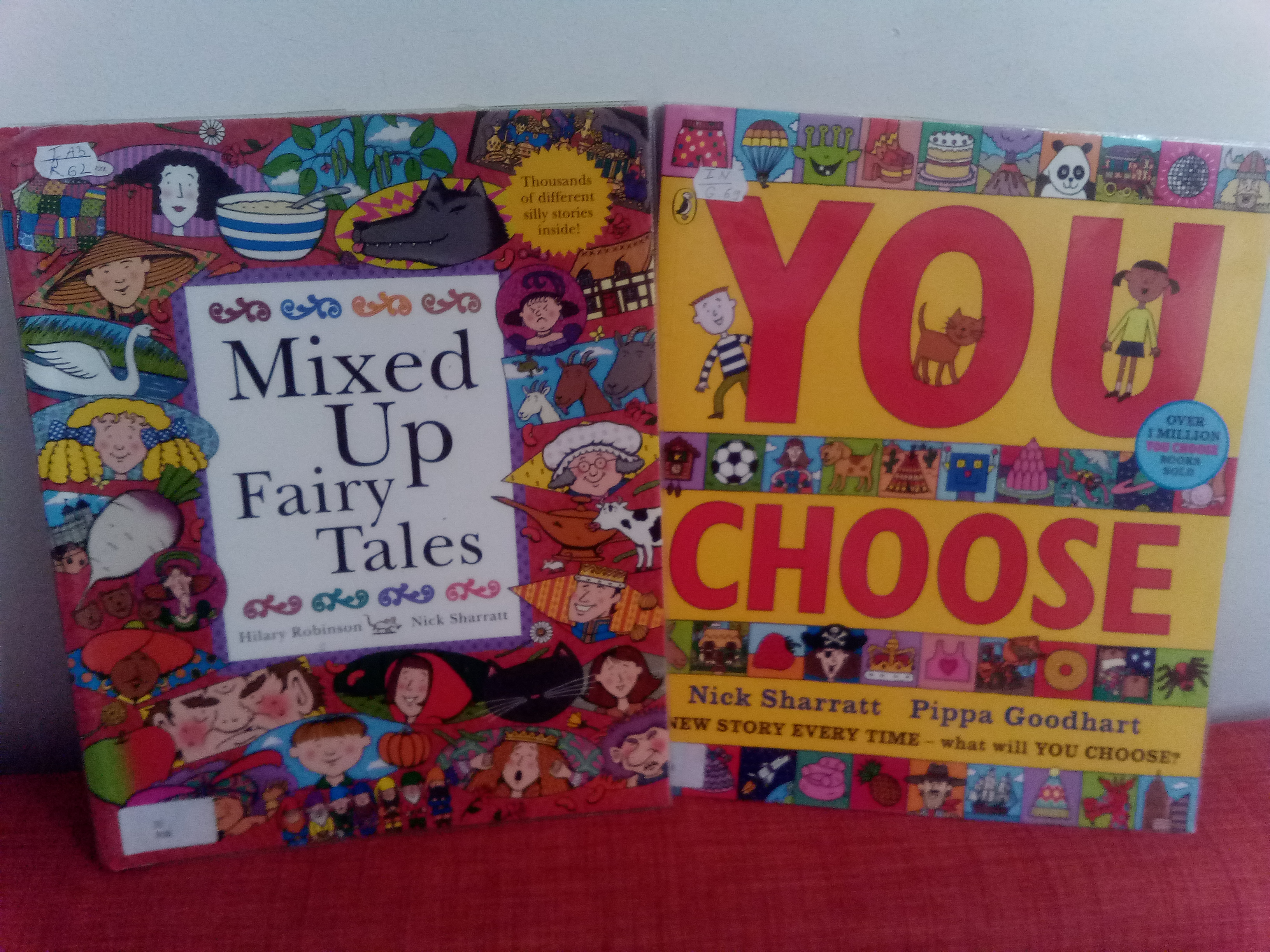 Am început luna cu două cărți în engleză, de fapt, împrumutate de la biblioteca „Ion Creangă”, You Choose de Pippa Goodhart și Nick Sharratt (în care copilul este invitat să-și creeze propria poveste) și Mixed Up Fairy Tales de Hilary Robinson, care are paginile tăiate astfel încât să amesteci elemente din mai multe povești pe o pagină întreagă și să creezi astfel situații comice.
