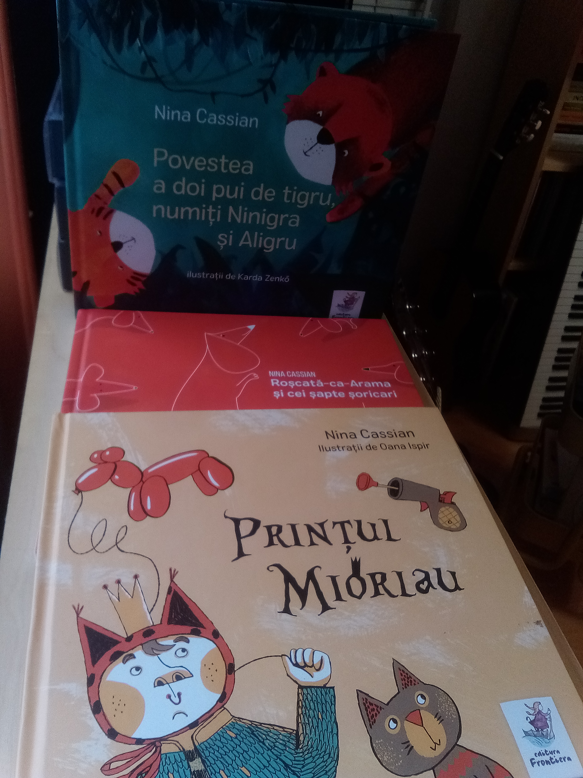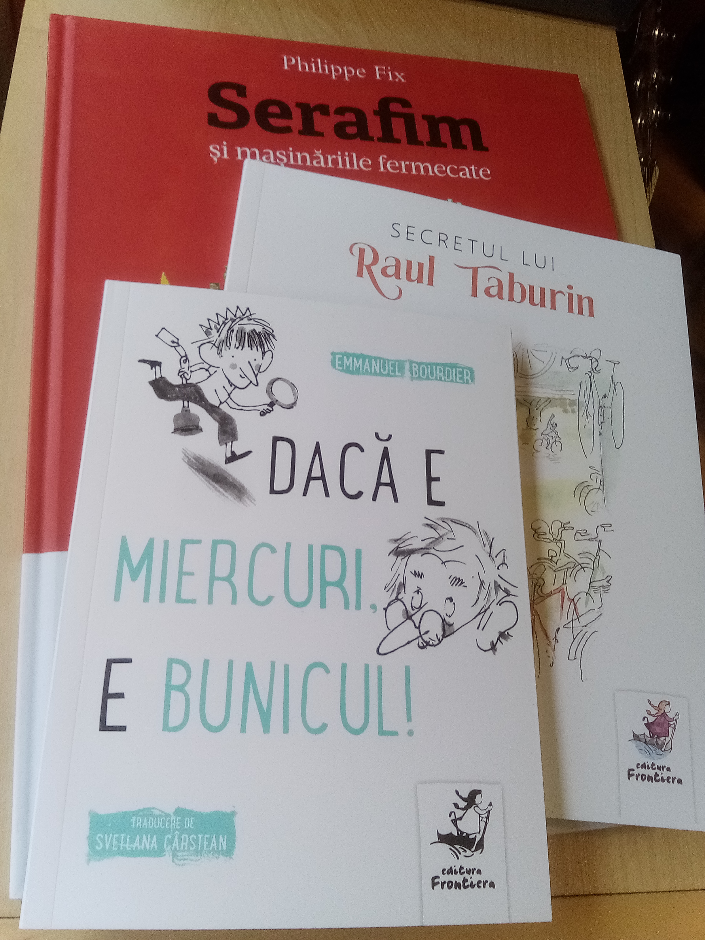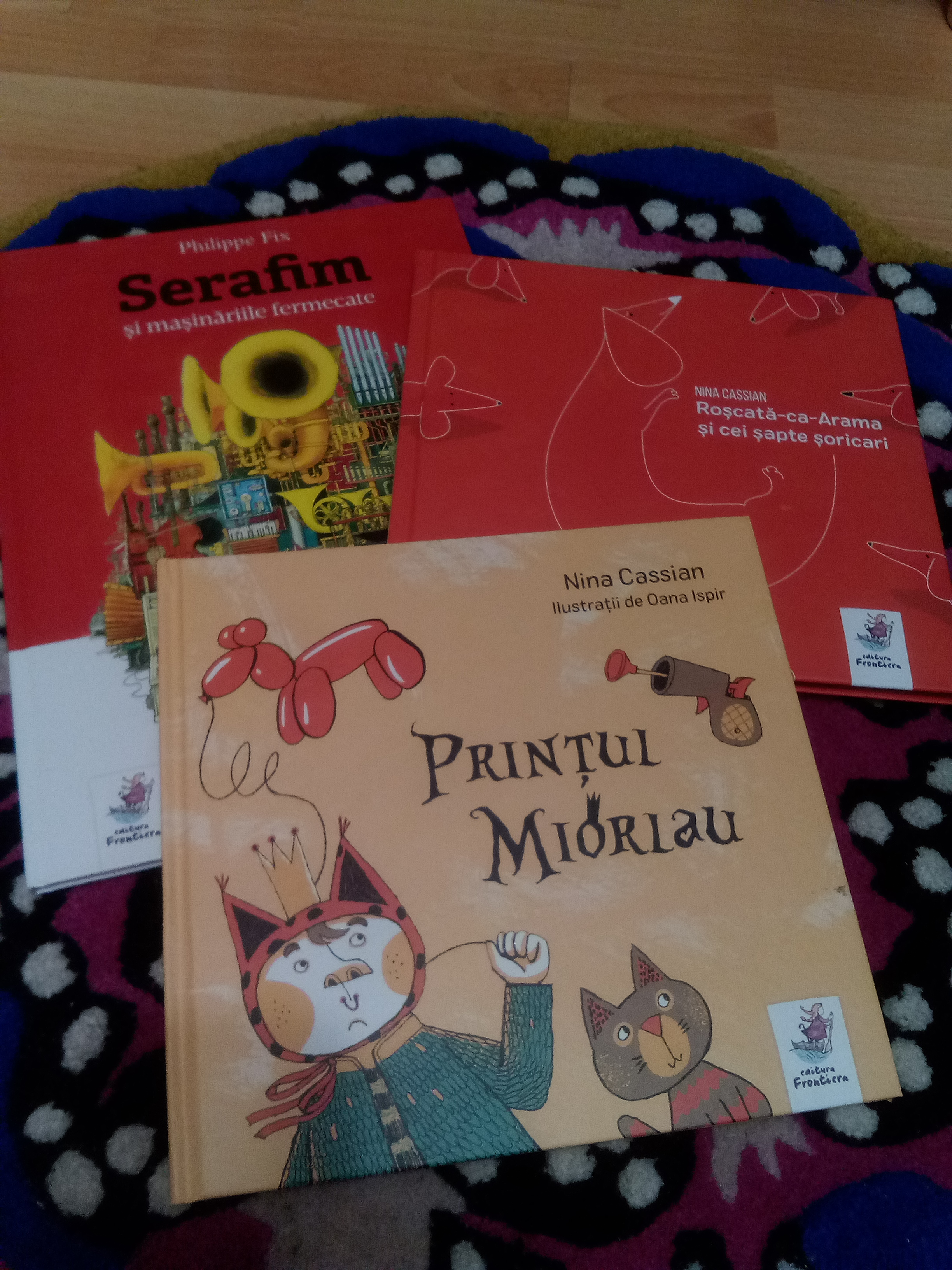Imediat după ziua lui Mihai, ne-a sosit un colet cu cărți promis de cei de la Editura Frontiera, dintre care am citit deja Dacă e miercuri, e bunicul! de Emmanuel Bourdier (superbă!), Povestea a doi pui de tigru, numiți Ninigra și Aligru de Nina Cassian (o poveste în versuri, un deliciu de citit cu voce tare!), Roșcată-ca-Arama și cei șapte șoricari de Nina Cassian (o altă poveste în versuri foarte drăguță), Prințul Miorlau de Nina Cassian (o colecție de poezii despre copii care fac tot felul de năzbâtii) și Serafim și mașinăriile fermecate de Philippe Fix (o carte ilustrată despre inventivitate și dorința de a avea un loc).