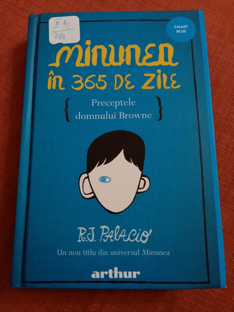 Și, ca să vedeți coincidență, săptămâna trecută am ajuns în sfârșit din nou la biblioteca de cartier (tot la insistențele lui Mihai, care face orice numai să stea cât mai puțin afară!), unde am descoperit că au adus noutăți, printre care și Minunea în 365 de zile – Preceptele domnului Browne de aceeași R.J. Palacio, o antologie de citate.