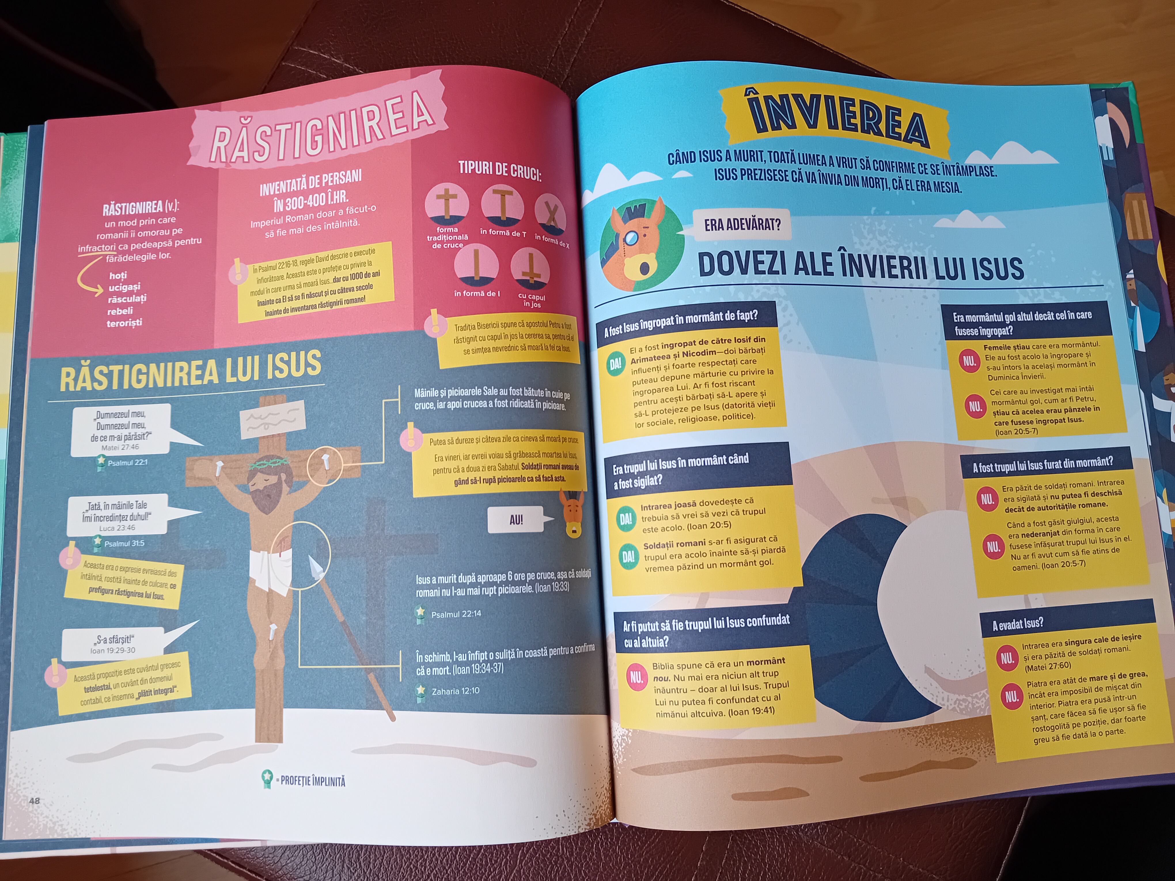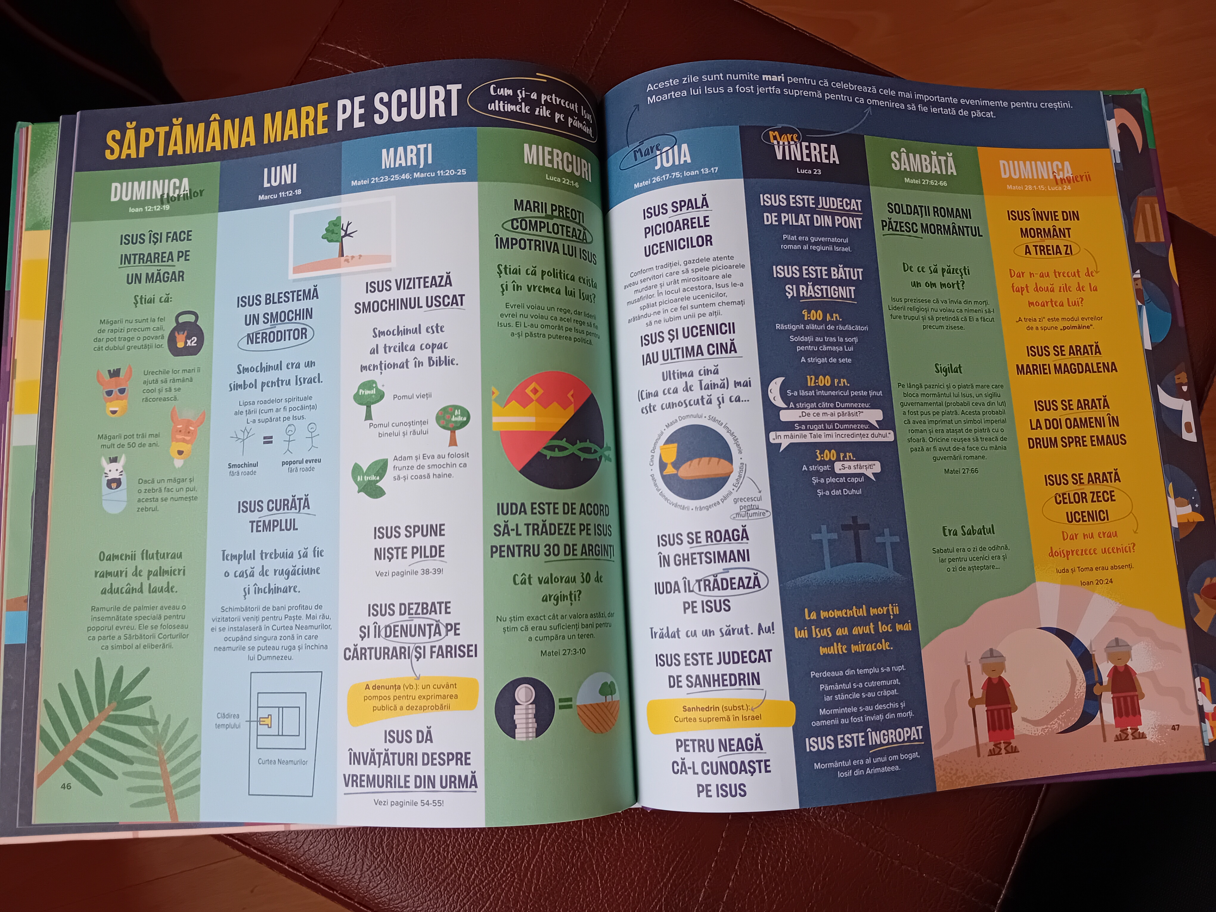 Mihai, băiatul meu de 8 ani nu a terminat-o încă de citit pe toată, dar la un moment dat s-a apucat să caute în Biblie referințele din Vechiul Testament de la paginile cu profeții despre Isus, iar paginile lui preferate sunt cele despre Săptămâna Mare, pentru că „sunt frumos ilustrate” și sunt ușor de urmărit.