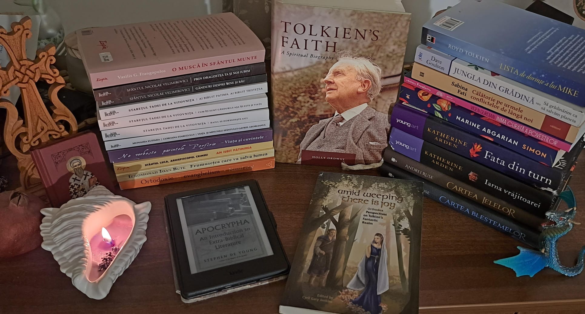 Ca pregătire pentru evenimentul special de la librăria Stephanus cu ocazia Tolkien Reading Day, printre altele, am citit Tolkien’s Faith. A Spiritual Biography de Holly Ordway, o lucrare foarte bună prin care l-am descoperit pe Tolkien catolicul, credinciosul, relația sa cu Dumnezeu, cu Biserica și cu Scriptura. Tot legat de Tolkien, am mai citit Amid Weeping There is Joy, o carte de eseuri și perspective asupra universului lui Tolkien, prin lentilele unor preoți, teologi, filologi pe teme legate de redobândirea unei imaginații fermecate într-o lume dezvrăjită și rolul acesteia în creșterea spirituală, importanța lecturii poveștilor, viața în biserică, în familie.