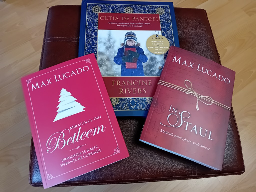 Primul dintre ele se numește Cutia de pantofi de Francine Rivers (autointitulată „O poveste emoționantă despre credința simplă, dar inspiratoare a unui copil) și cuprinde o povestioară, un devoțional săptămânal de Advent și câteva rețete.
