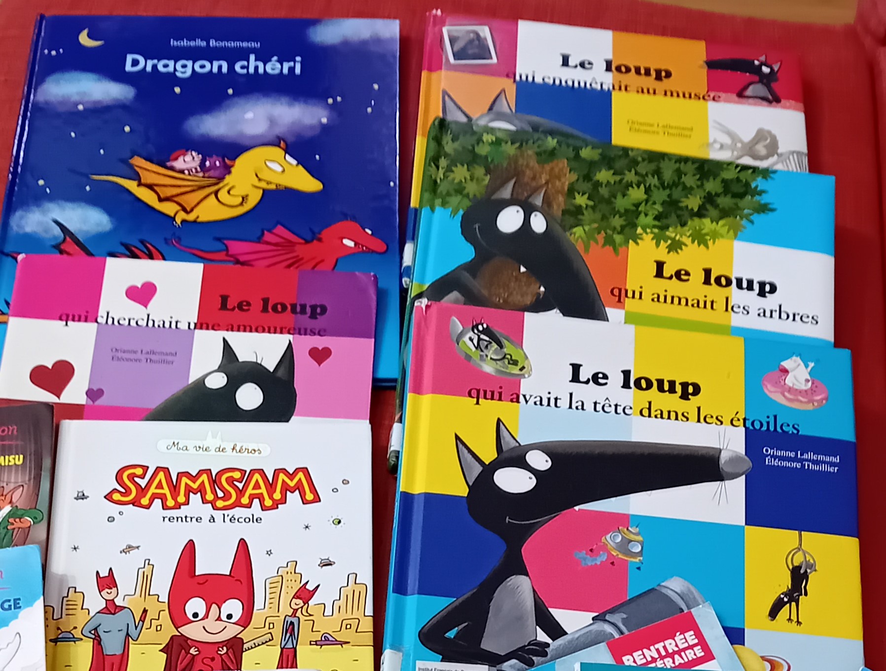 Între timp, i-am citit și lui Mihai dintre cărțile luate de la Institut, Dragon chéri de Isabelle Bornaneau, SamSam rentre à l’école de Serge Bloche și pe cele cu Lupul (dar pe acelea de fapt le mai citisem și altă dată, așa că nu le-am mai pus acum la socoteală).