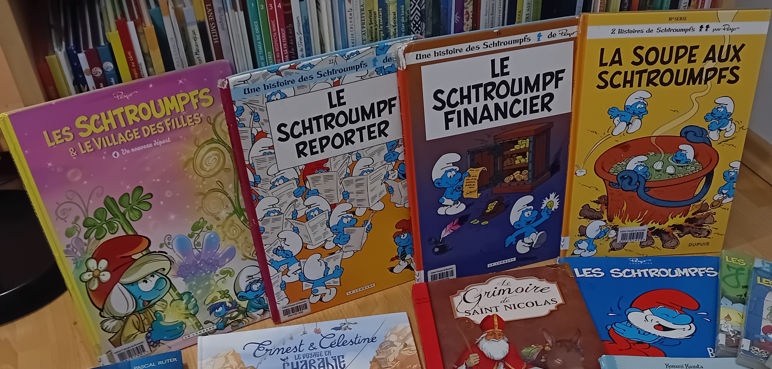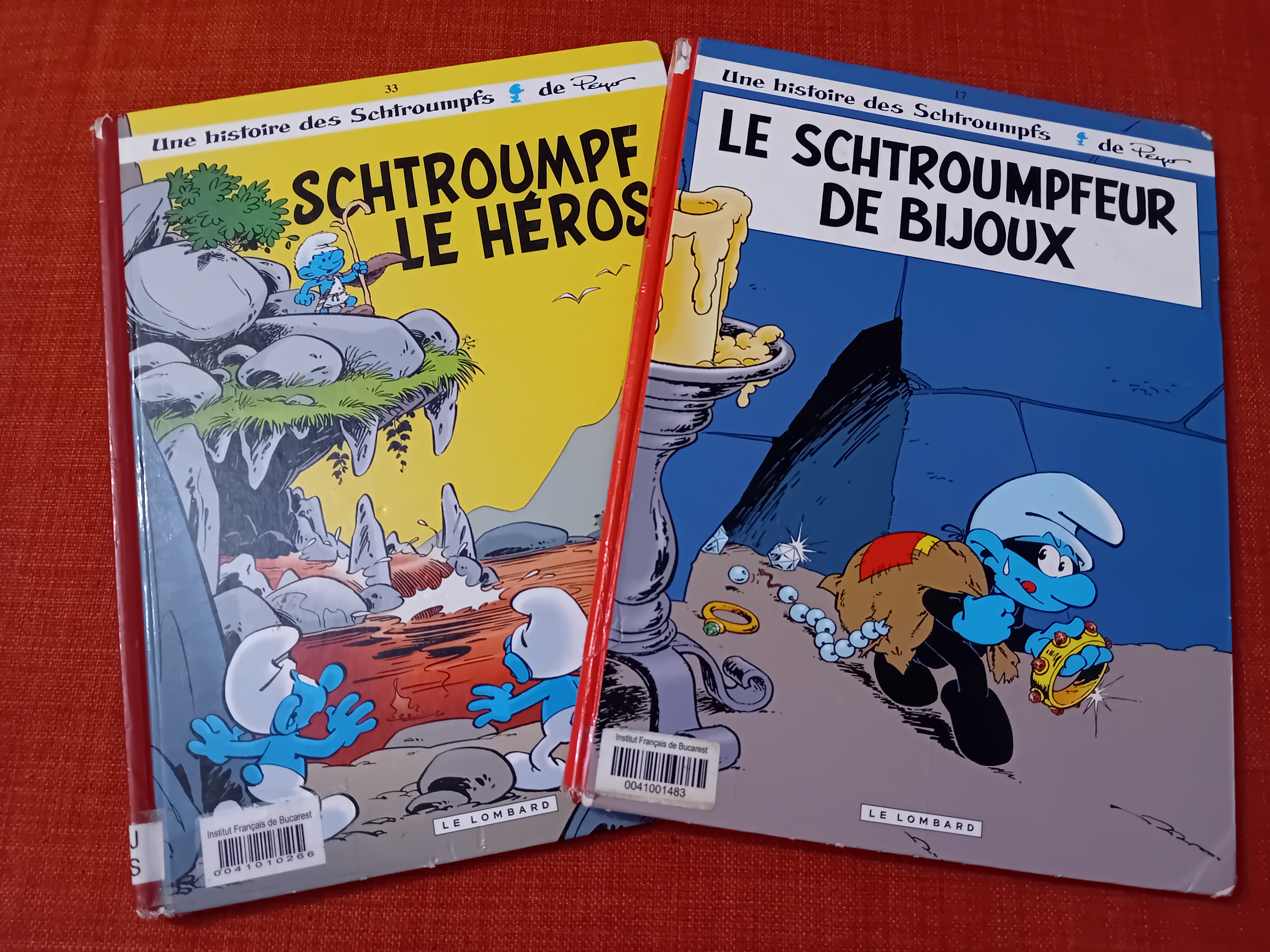 Tot ca material pentru distragere și gestionarea anxietății am citit în zilele următoare mai multe volume cu Ștrumfi: Le Schtroumpf financier, Schtroumpfs – 120 Blagues et autres surprises (care ne-a plăcut mult), Le Schtroumpf Reporter, Les Schtroumpfs et le village des filles – Tome 4 – Un nouveau départ și, mai spre sfârșitul lunii, La Soupe aux Schtroumpfs.