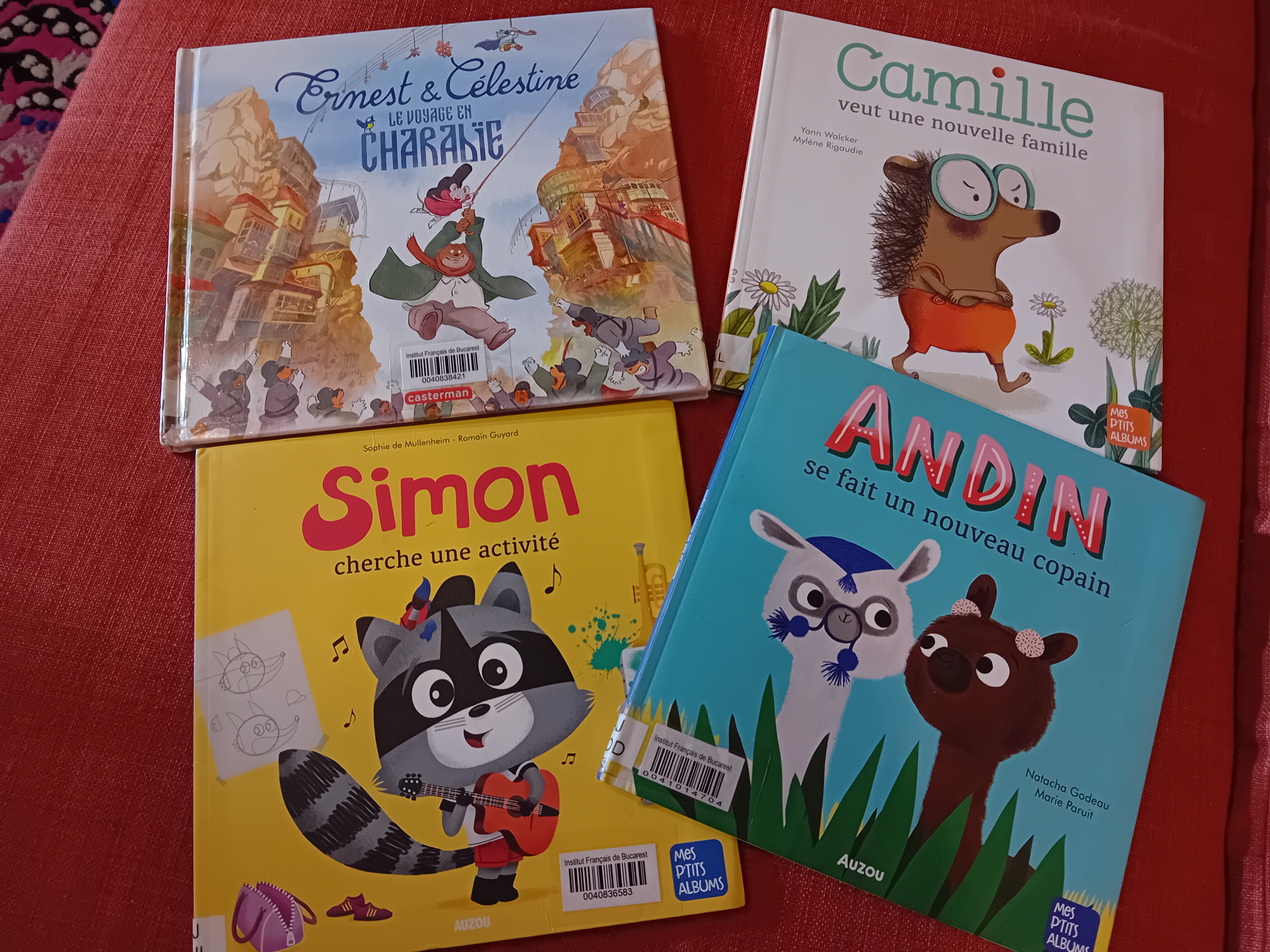 Într-o zi în Cărturești am citit și nou-apăruta carte scrisă și ilustrată de actrița Keira Knightley, Te iubesc exact la fel, iar apoi i-am mai citit lui Mihai patru cărți de la Insitut: Simon cherche une activité de Sophie de Mullenheim și Romain Guyard, Andin se fait un nouveau copain de Natacha Godeau și Marie Paruit, Camille veut une nouvelle famille de Yann Walcker și Mylène Rigaudie (care nu prea mi-a plăcut pentru că include și o familie cu doi tați) și Ernest et Célestine – Le voyage en Charabie: L’album du film de Alexandra Garibal.