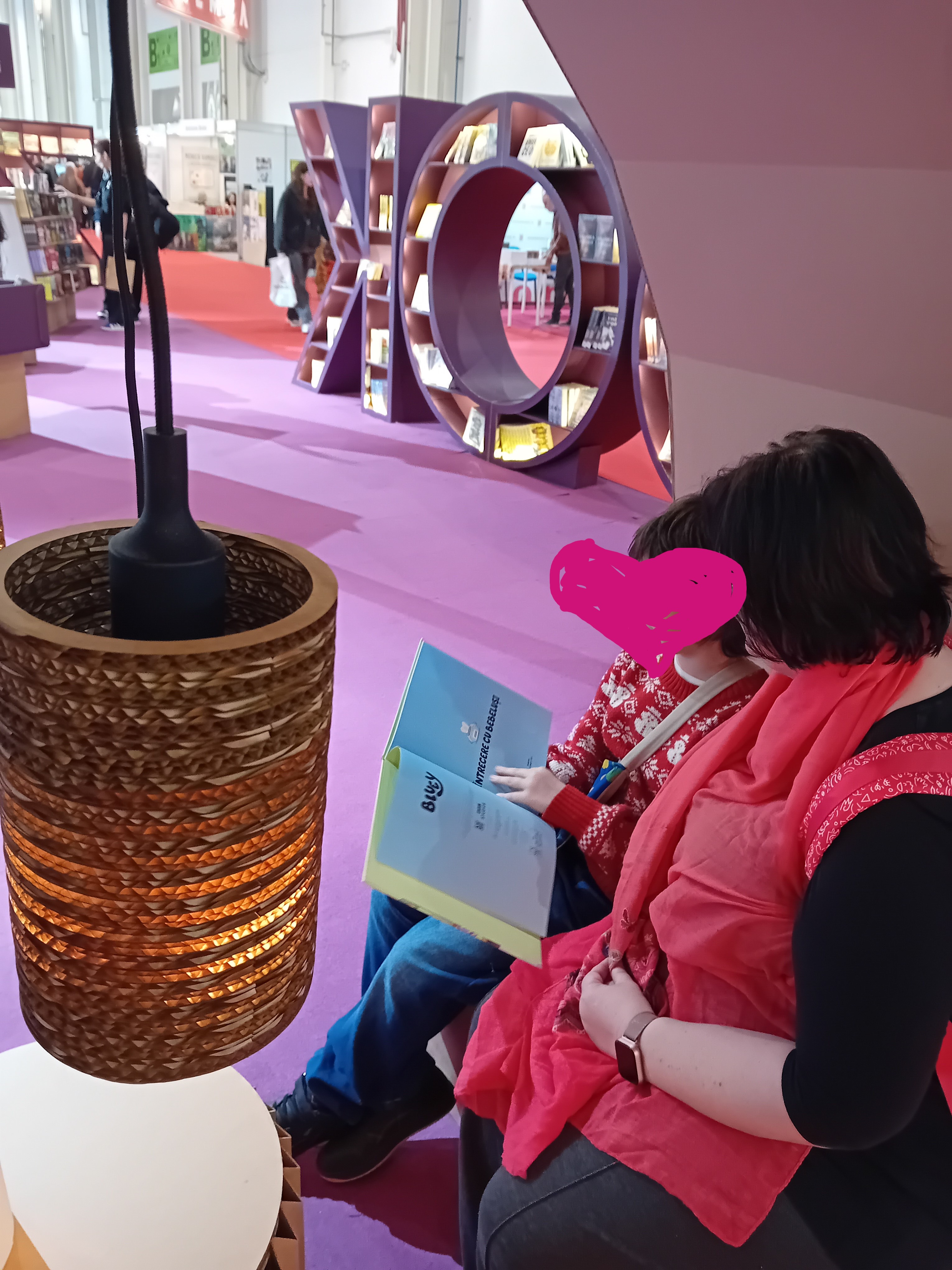 După o pauză și o felie de pizza, am reintrat cu o dispoziție mai bună, Mihai a petrecut ceva timp citindu-i bunicii două cărți cu Bluey la standul Bookzone, unde aveau un separeu de stat jos, în timp ce eu le-am făcut poze și m-am mai dus pe ici, pe colo, luându-mi și cartea de la Galaxia Gutenberg cu doar 20 lei! Și e o ediție mult mai frumoasă decât arată în poză!