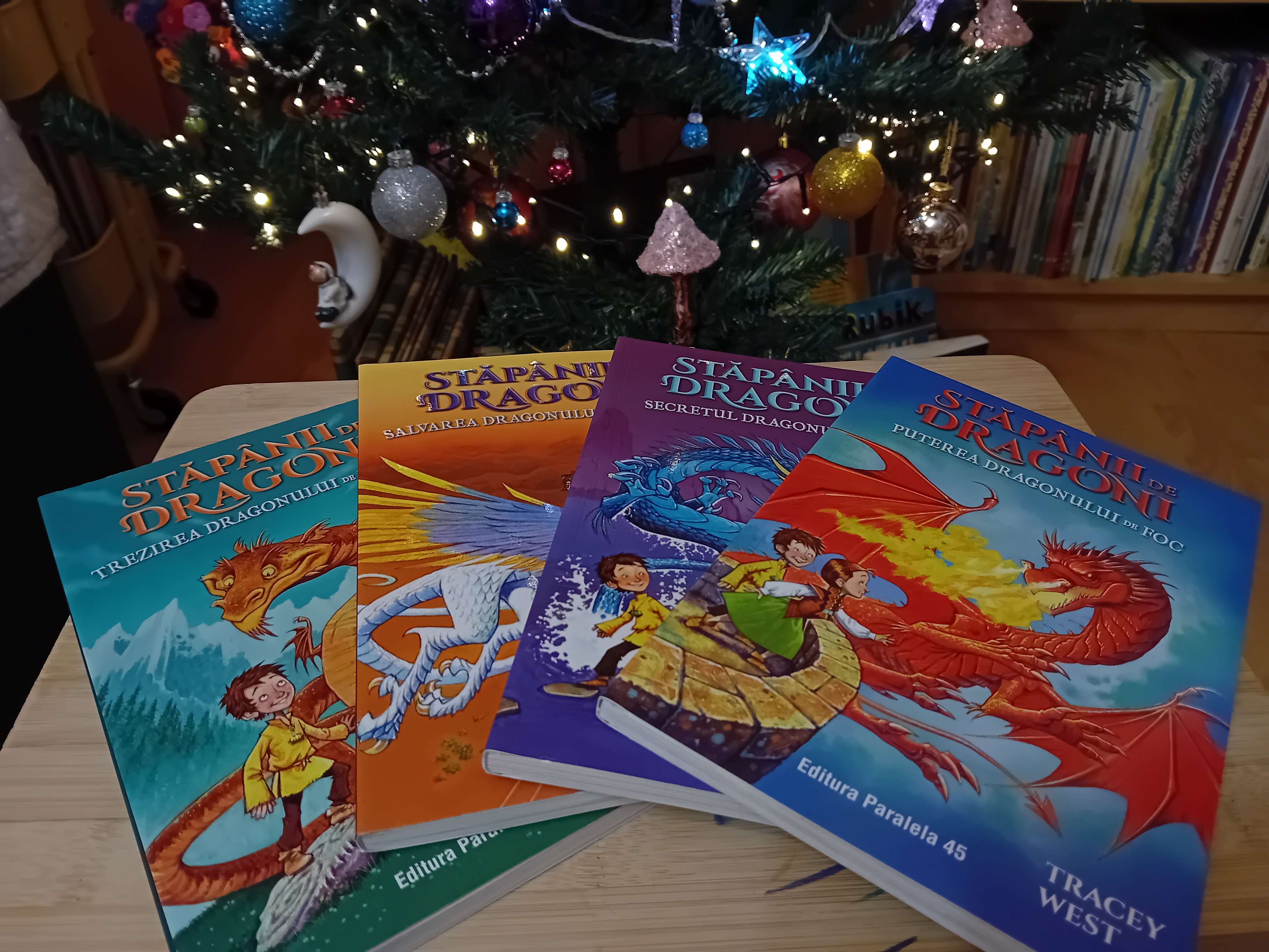 Ne-am mai învârtit puțin încercând să-i retrezim entuziasmul și ne-am dus la Editura Paralela 45 pentru Portalul magic, care, spre dezamăgirea noastră nu aveau încă cele mai recente două volume pentru care veniserăm. Dar i-a atras atenția o altă serie cu dragoni și i-am luat cele patru volume Stăpânii de dragoni.
