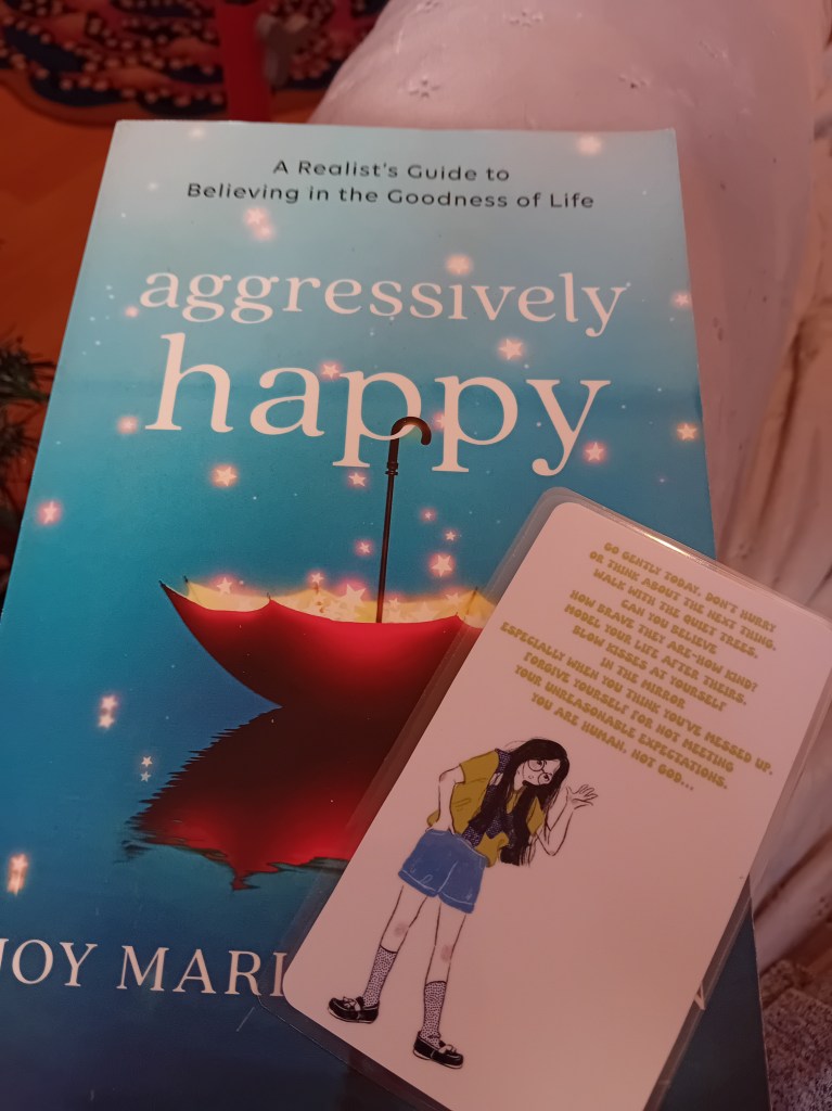 Am parcurs apoi cam într-o săptămână și un pic volumul Aggressively Happy de Joy Marie Clarkson, care mi s-a părut că a mers mai greoi la început și ar fi mai potrivit pentru cei aflați în intervalul de vârstă 20-30 de ani, dar per total a fost o lectură plăcută și drăguță. Mi-au plăcut paginile de la finalul fiecărui capitol cu sugestii de citit, de văzut, de ascultat.