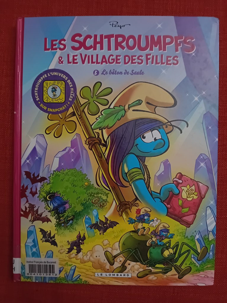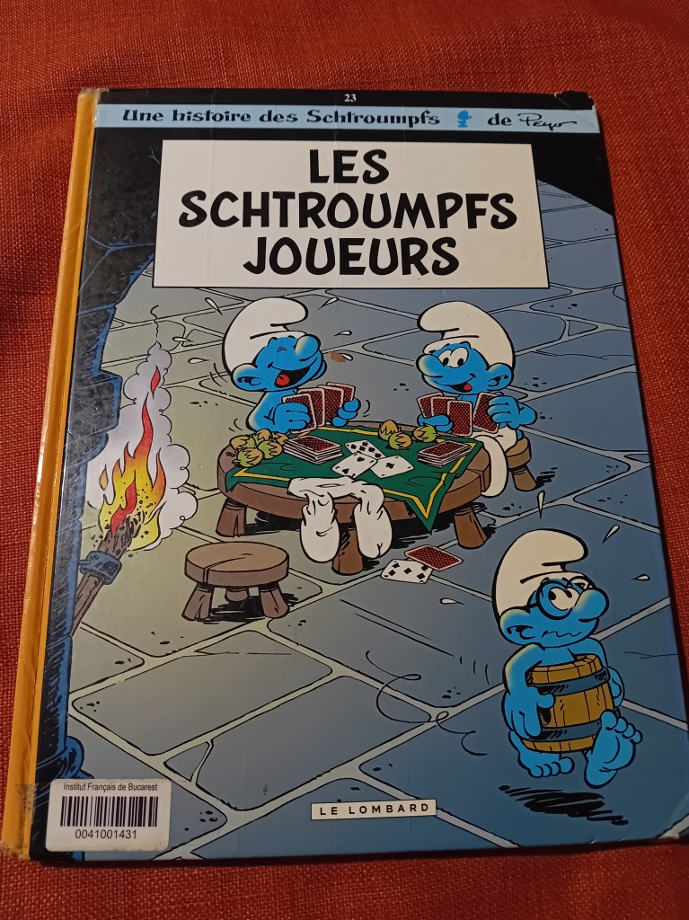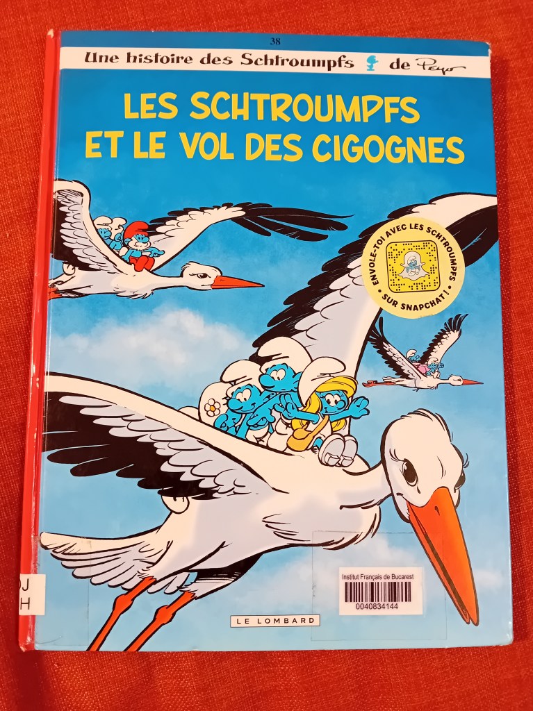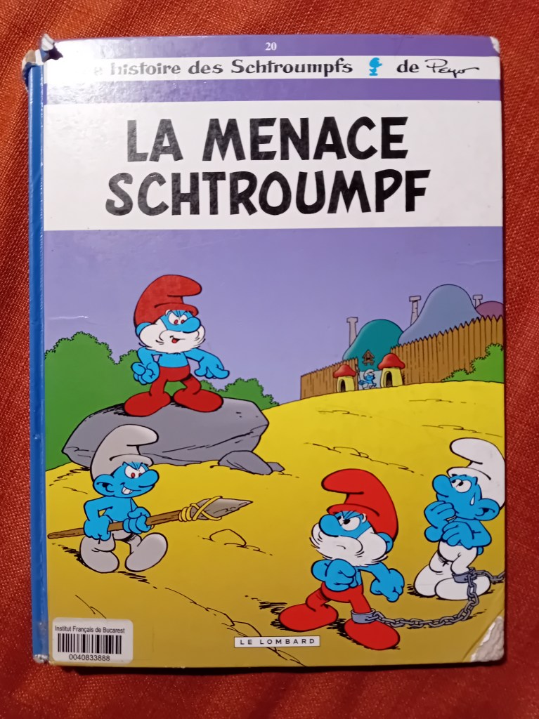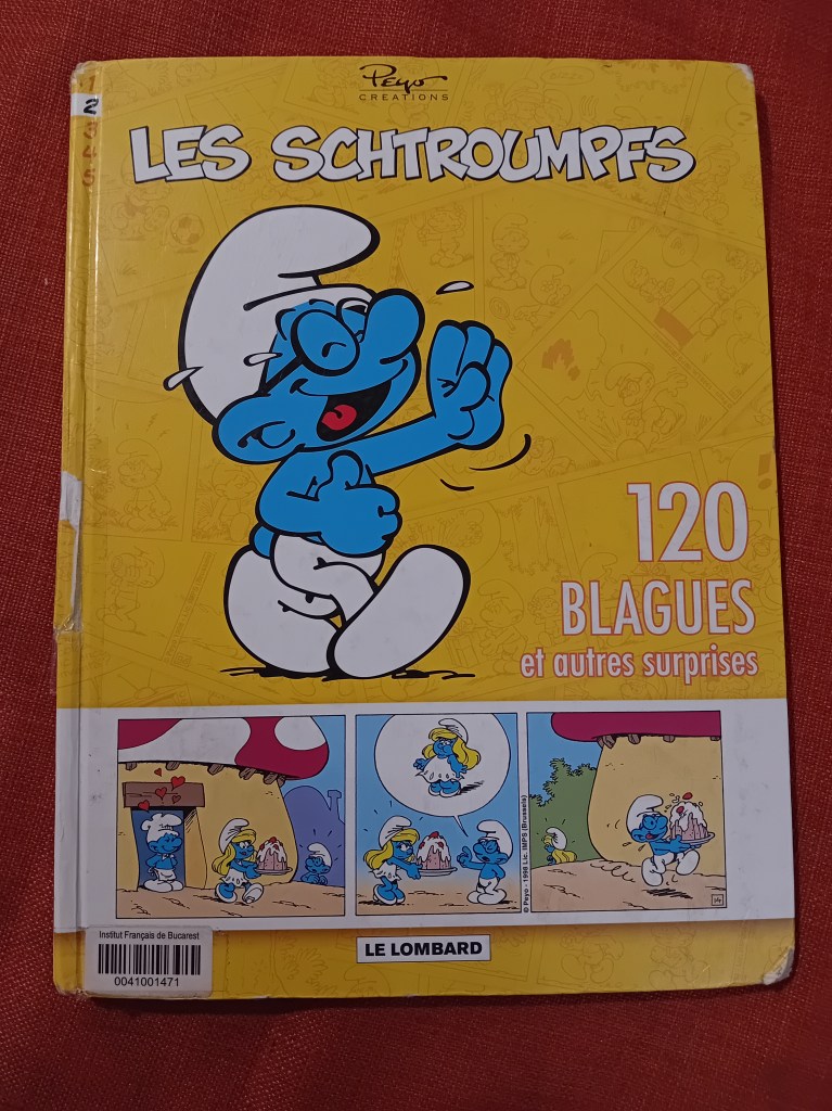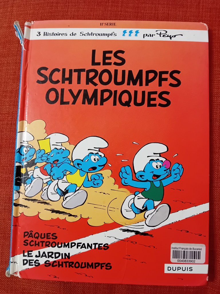 Între timp, i-am citit lui Mihai pe parcursul întregii luni șase volume cu benzi desenate sau glume cu Ștrumfi, împrumutate de la Institutul francez, și anume: La Menace Schtroumpf, Les Schtroumpfs et le Village des Filles #5: Le bâton de Saule (care am descoperit că e primul dintr-o sub-trilogie, prin urmare, le-am comandat pe toate trei de la Librăria Kyralina), Les Schtroumpfs olympiques, Les Schtroumpfs Joueurs (ăsta a fost chiar amuzant), Les Schtroumpfs et le vol des cigognes și un volum de glume, Les Schtroumpfs – 120 blagues et autres surprises (vol. 2).