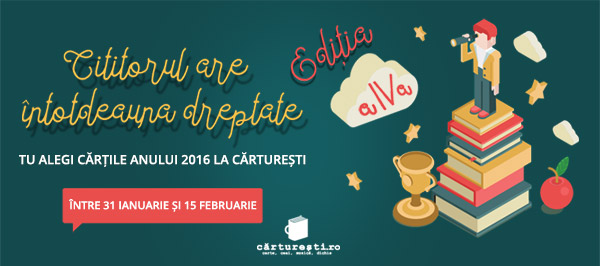 5d487aae-dadc-49bf-a7bc-b455bd7762f5Dacă vreți să aveți ocazia să câștigați niște cărți, nu pierdeți nici anul acesta concursul Cărțile anului pe cărturești.ro, unde tot ce trebuie să faceți este să votați cărțile voastre preferate de anul trecut din categoriile ficțiune, non-ficțiune, poezie și carte pentru copii.